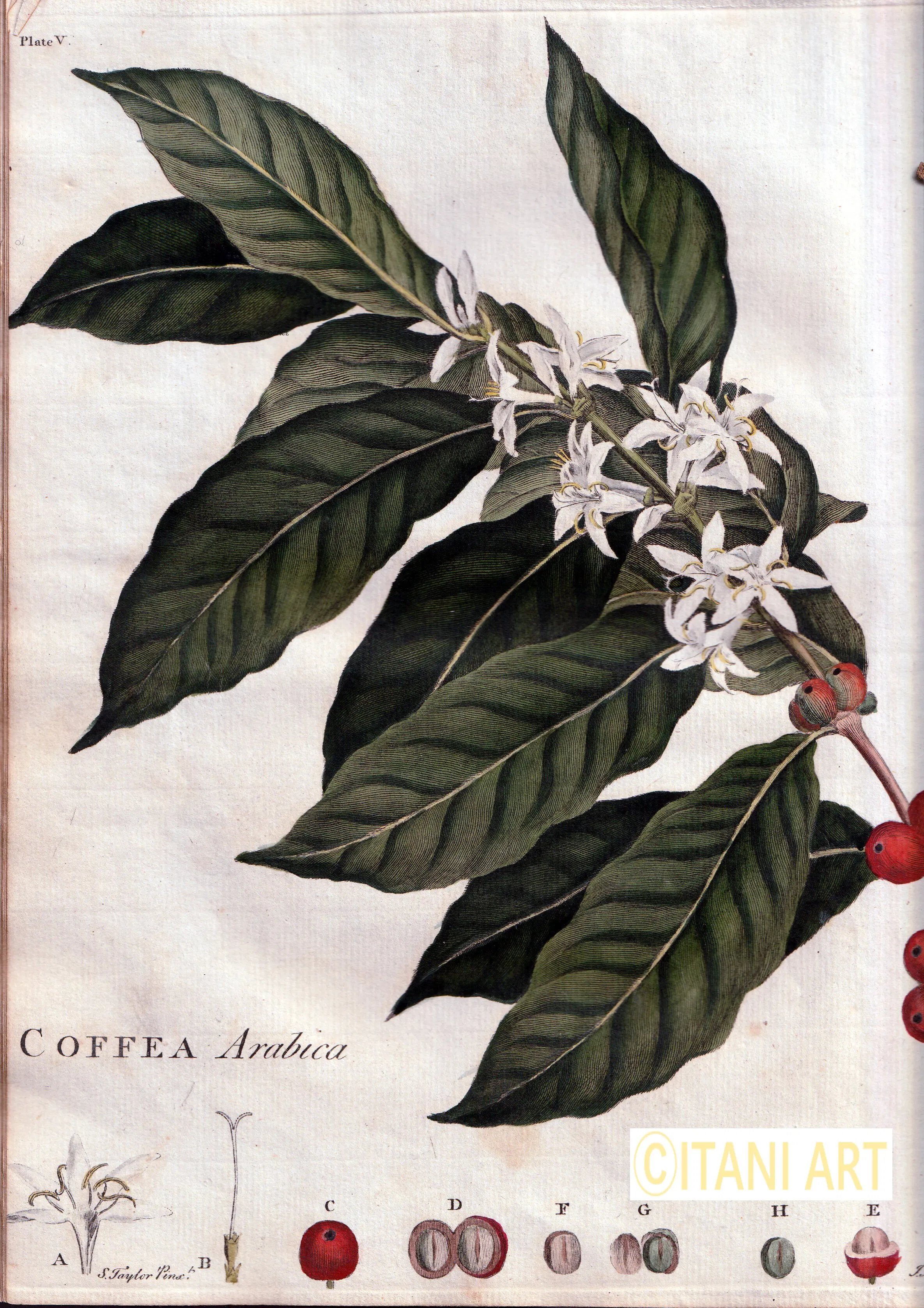 医師で植物コレクター・ジョン・フォザーギル(1712-1780)によるエチオピア産のコーヒー画。1782年に彼の業績を著された本に掲載されている。