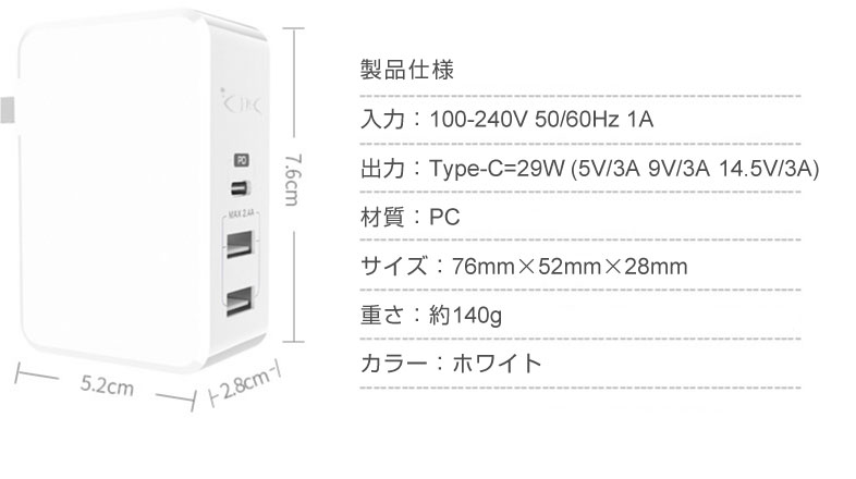 出力: Type-C=29W(5V/3A、9V/3A、14.5V/3A)※USB PD対応