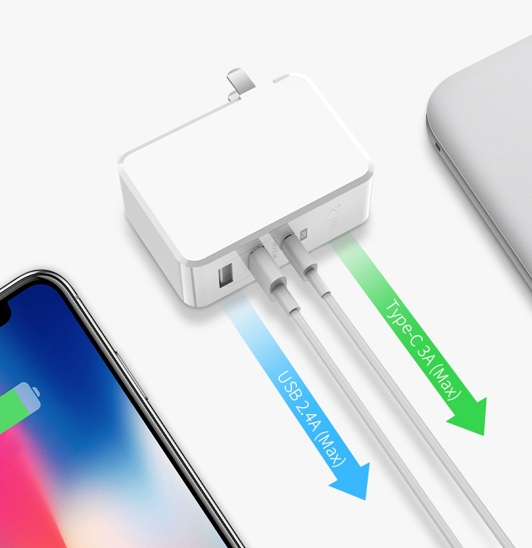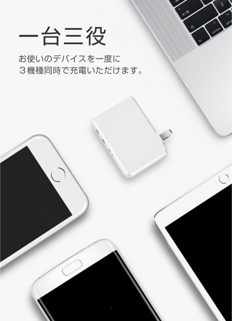 ノートPC、スマートフォン、タブレットなどを持って出張や旅行に行く際、従来はそれぞれのACアダプターを持参する必要がありましたが、当商品が1つあれば同時に3つのデバイスの充電ができます。