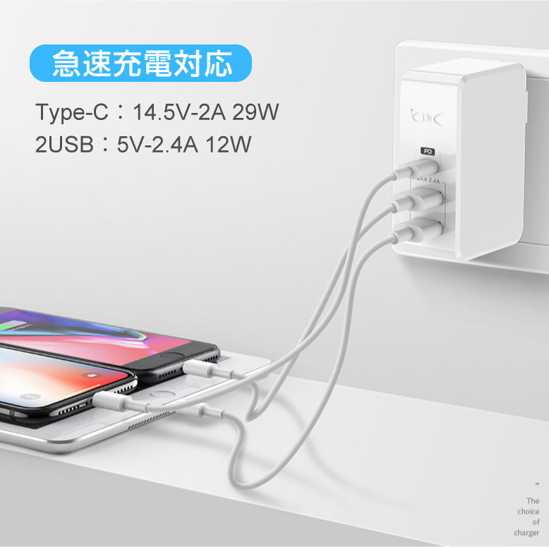 ・USB Type-Cポート×1、Type-Aポート×2を搭載し、3台のデバイスを同時充電可能