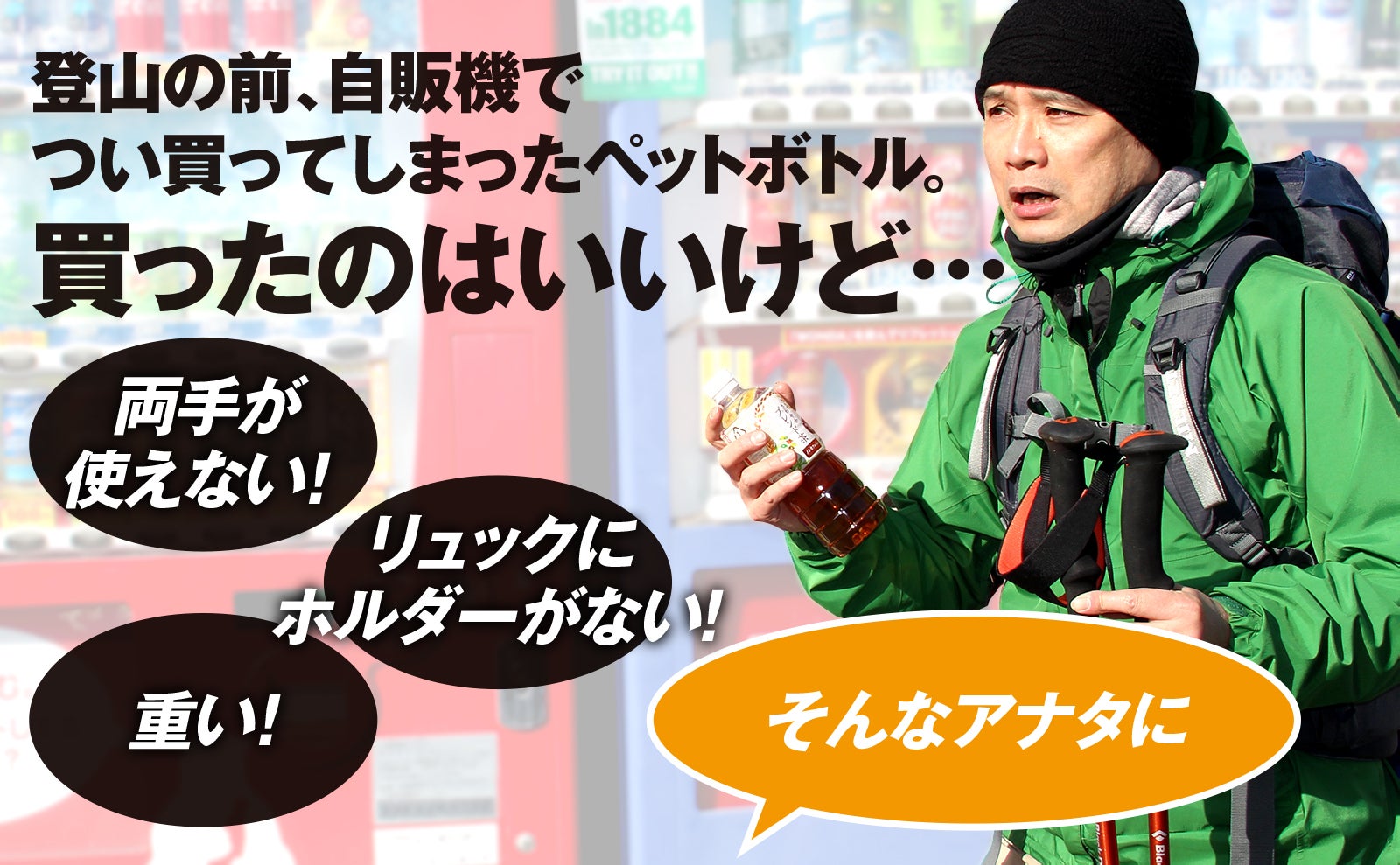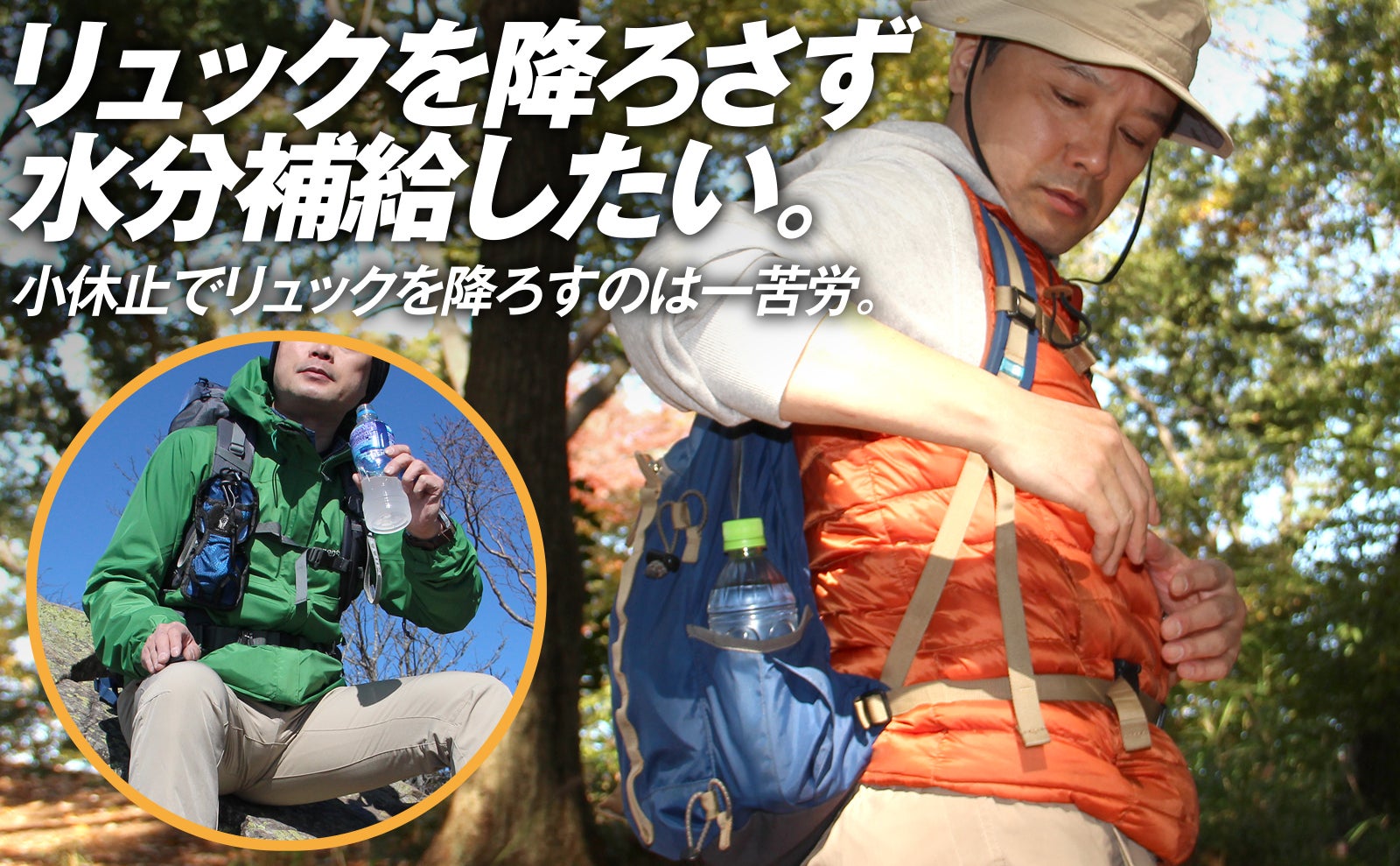 ストックを持ってるし、リュックにボトルホルダーは無い。仕方なくリュックに入れるけど、いちいちリュックを降ろして取り出すのが面倒だなぁ。そんなことが結構ありませんか?