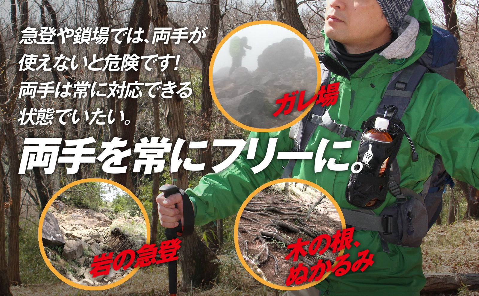 気軽に出かけたはずの低地登山でも、思わぬ急登が待っていることがあります。そんな時、軽い気持ちでペットボトルを片手持ちだったりすると事故につながる危険性があります。安全に登るためにも両手で身体のバランスを確保してください。