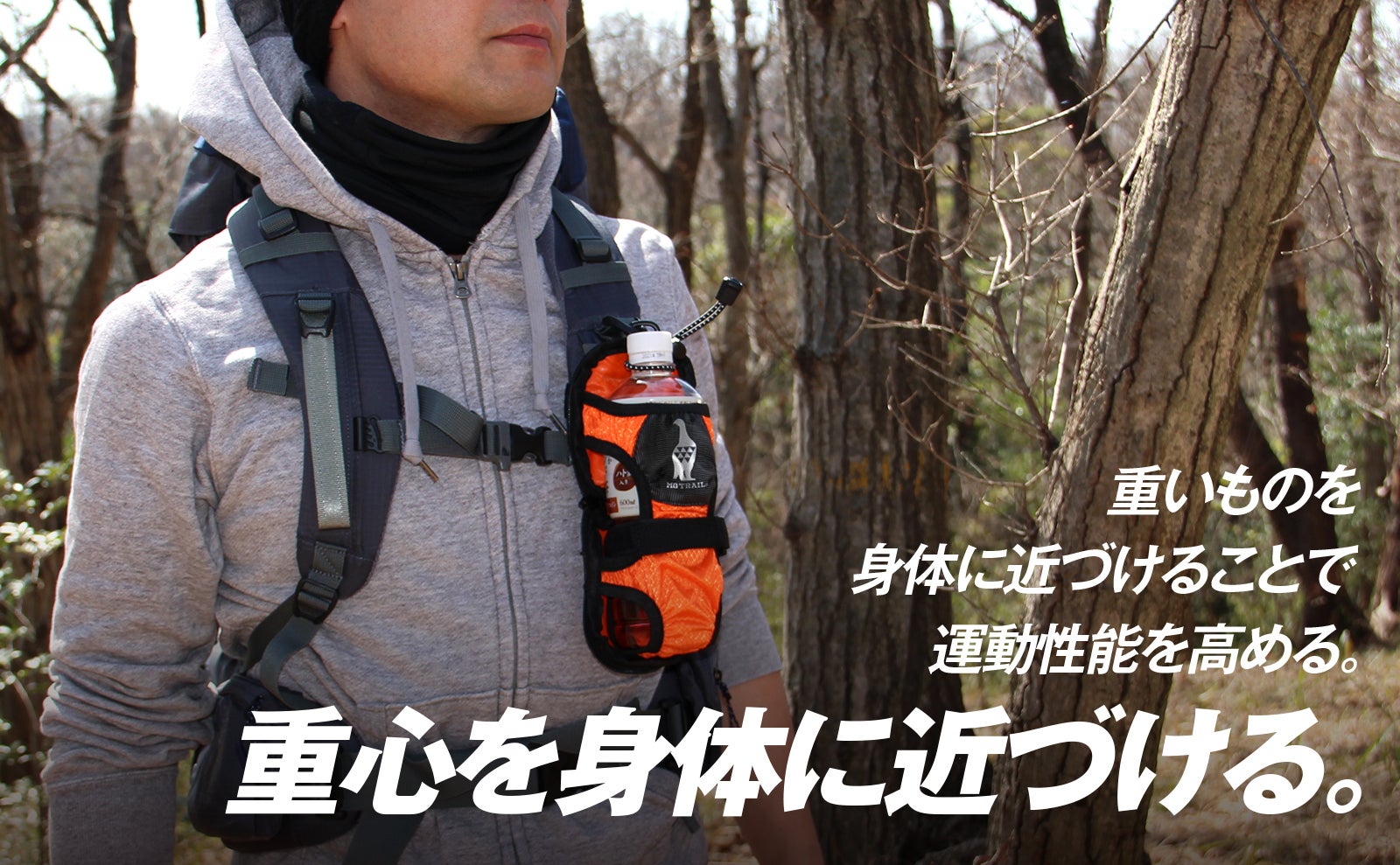 リュックなど重量物を身体の重心に集中させることで、余計な慣性が働きにくくなります。これは「マスの集中化」といいます。ペットボトルや水筒は携帯する荷物の中でも重量のあるもの。できるだけ身体に密着させることで軽量化と同等の効果があります。
