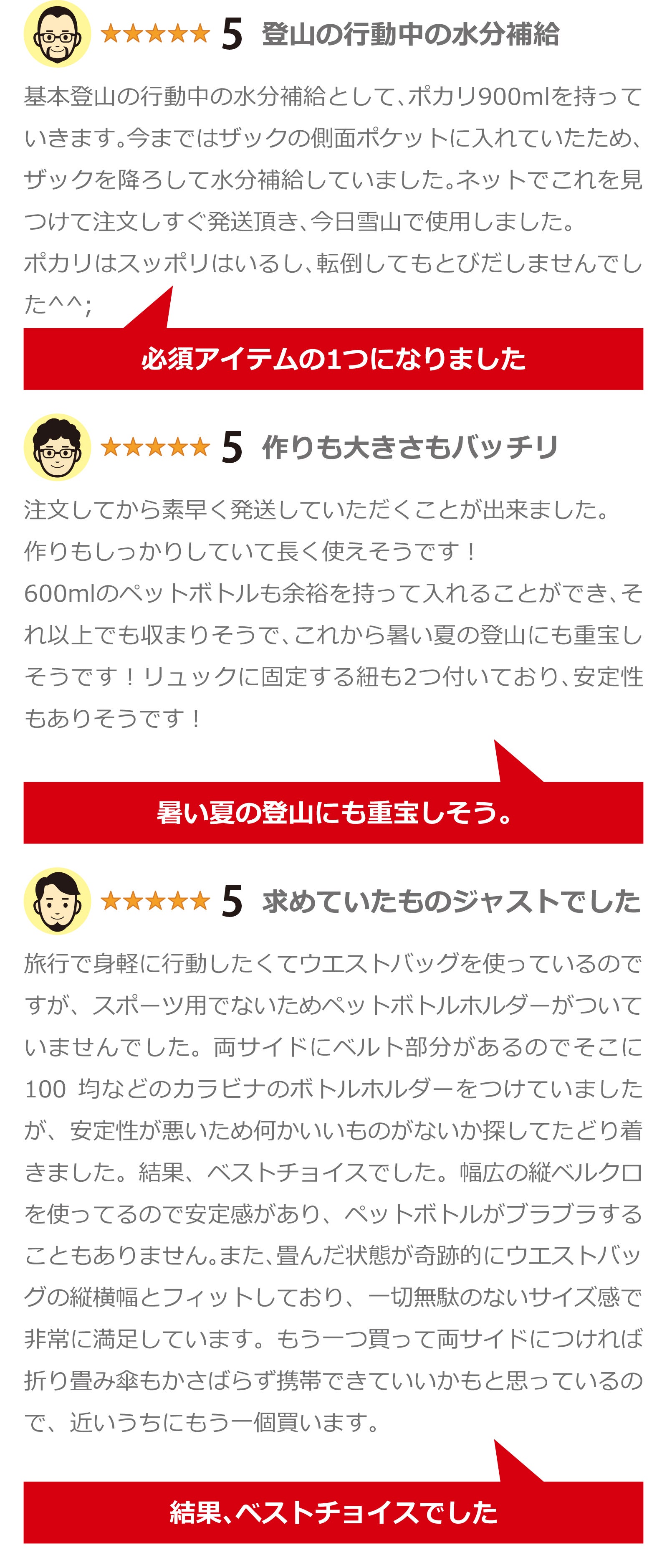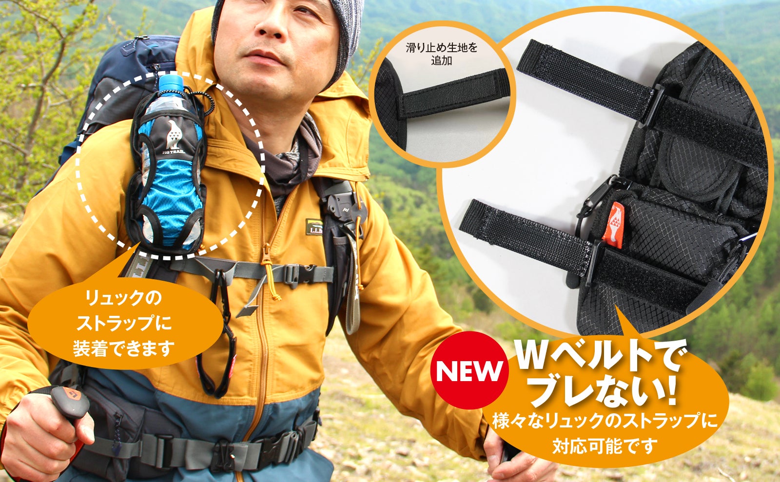 登山は自分の五体を使って山を登っていきます。そのため小さな行動でも体力を消耗します。装備を取り外したりするチョットした動きがスムーズにできるようになればと思いペットボトルホルダーを製作しました。今回のリニューアル版もぜひ皆様に使っていただき、素敵な山登りライフをお過ごしいただければ嬉しく思います(^^