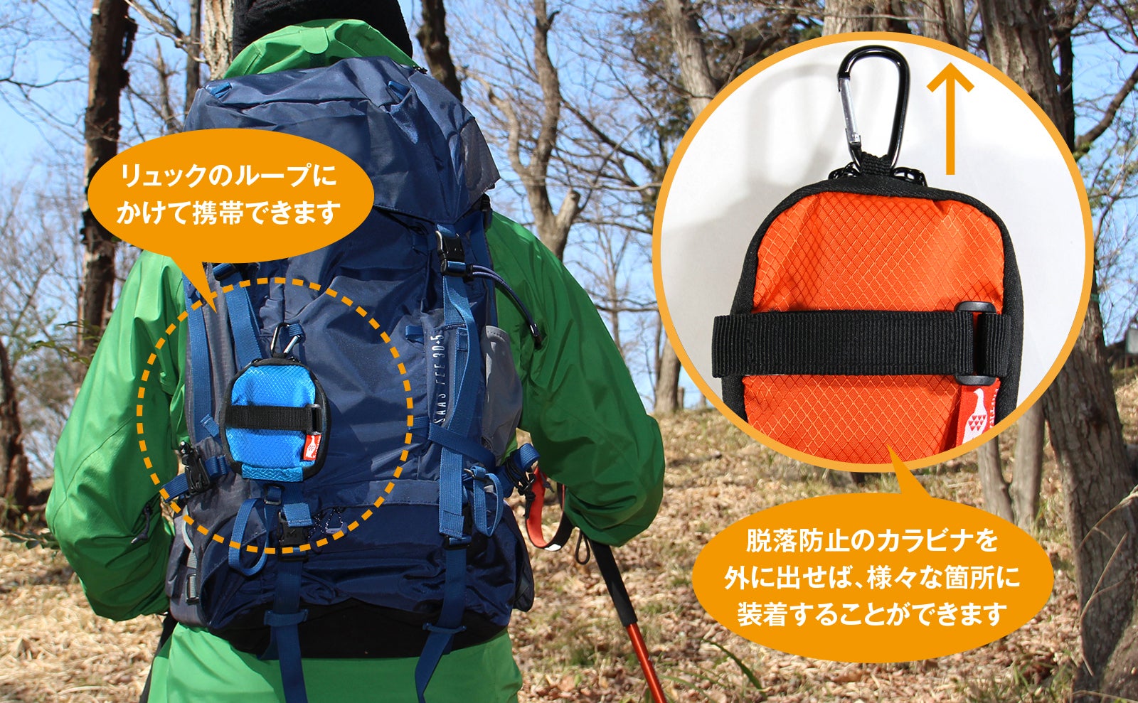 シーンに合わせて様々な携帯方法が可能です。リュックのストラップ、ズボンのベルト、カラビナでぶら下げたりと装備に合った装着方法を選ぶことができます。