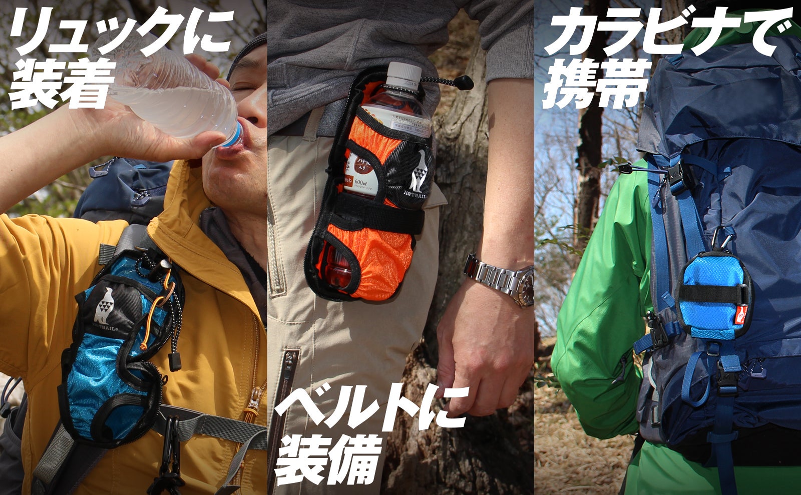 装着してみてわかる小さなペットボトルホルダーの携帯力。普段使うリュックや腰のベルトに装着が可能です。1リットルの水筒や折りたたみ傘など、登山だけでなくスポーツや普段の生活に携帯したいものを収納することができます。