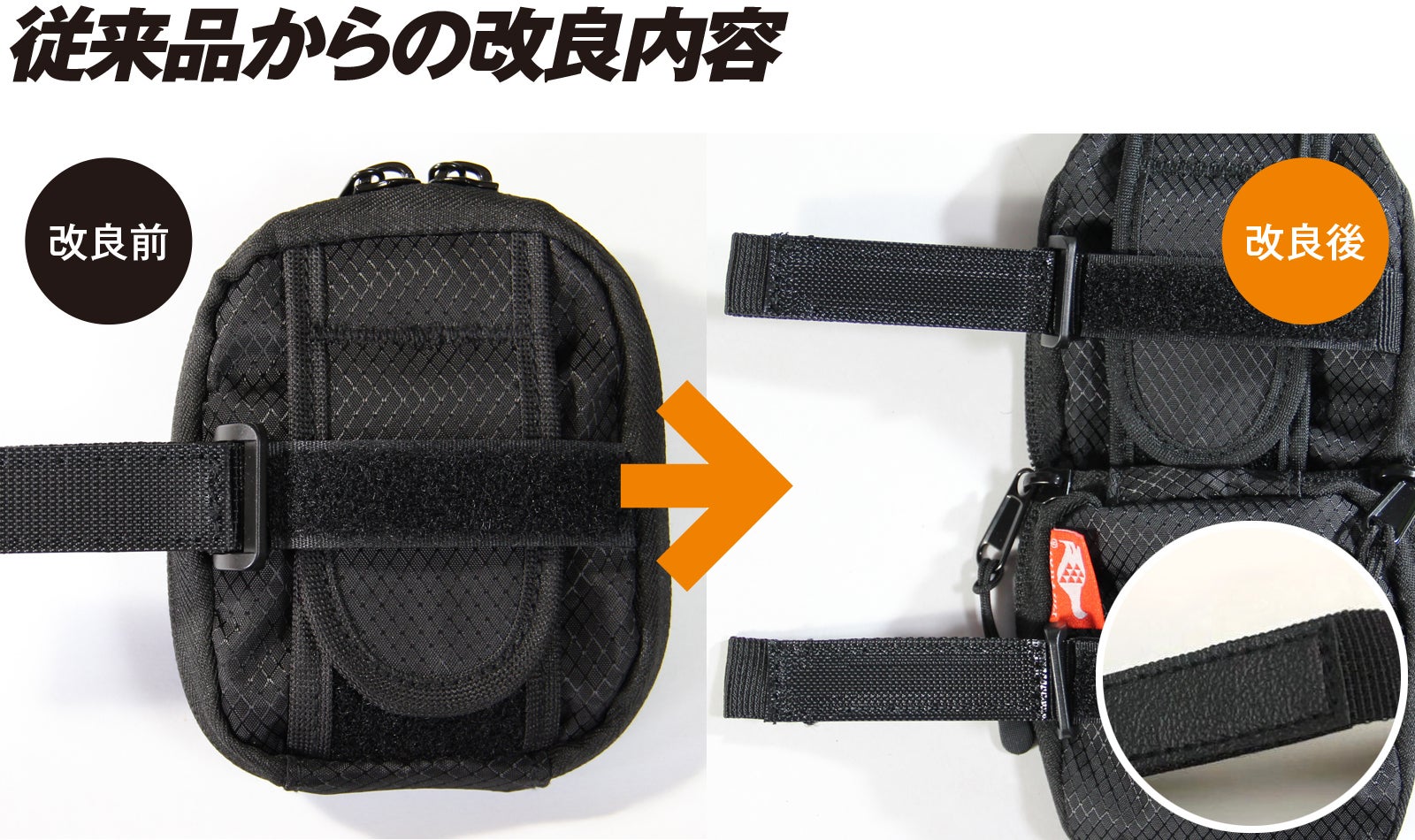 旧タイプの固定用面ファスナーベルトは上部だけだったため、リュックのストラップに対して固定が不十分でした。新タイプは下部にもベルトを追加。二点でストラップにしっかり固定できるので激しい動きでずれることを軽減できます。