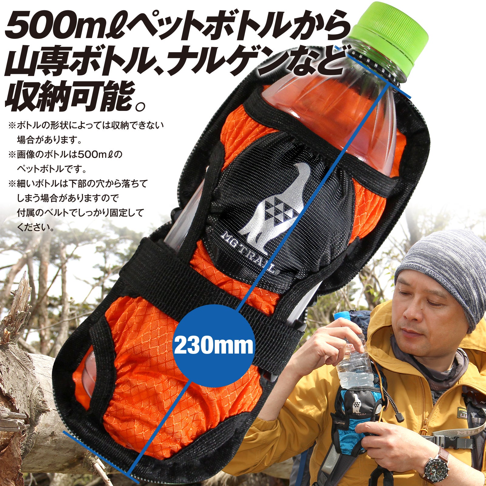 コンビニや自販機で気軽に購入できるペットボトル。すぐに購入できる分、手で持ち運ぶのは煩わしいことが多いです。体に装着することで重さを感じなくなり、いつでも水分を補給することができます。本体のホルダー部分はゴム素材を使っており、様々なペットボトルのサイズに合わせることが可能です。また、登山でよく使われている山専ボトルやナルゲンボトルも収納可能です。