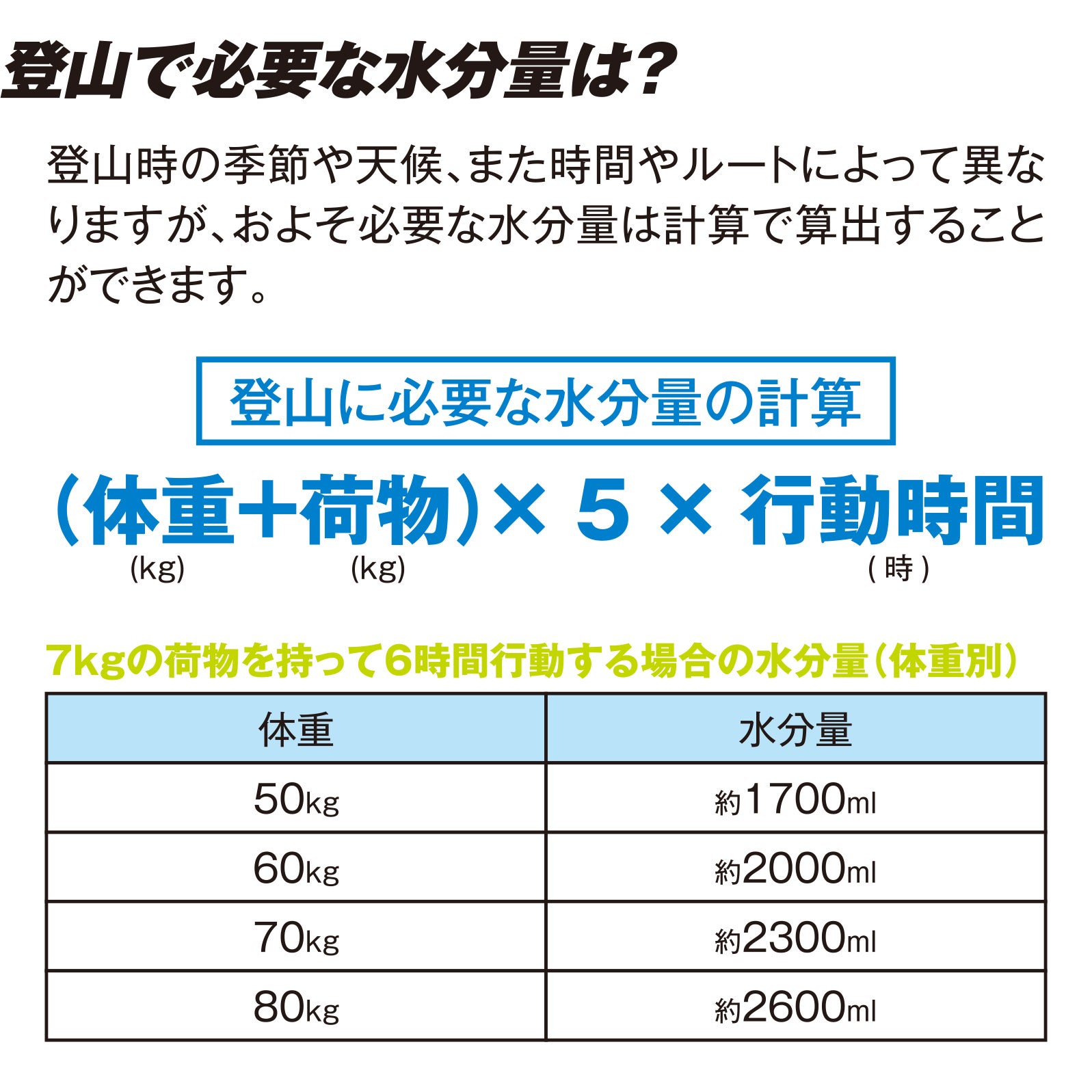 登山で行動する上での理想的な水分量は計算で求めることができます。上記の表を見ていただけると最低でも約2Lの水が必要です。これを一つの水筒に用意するのは現実的ではありません。
