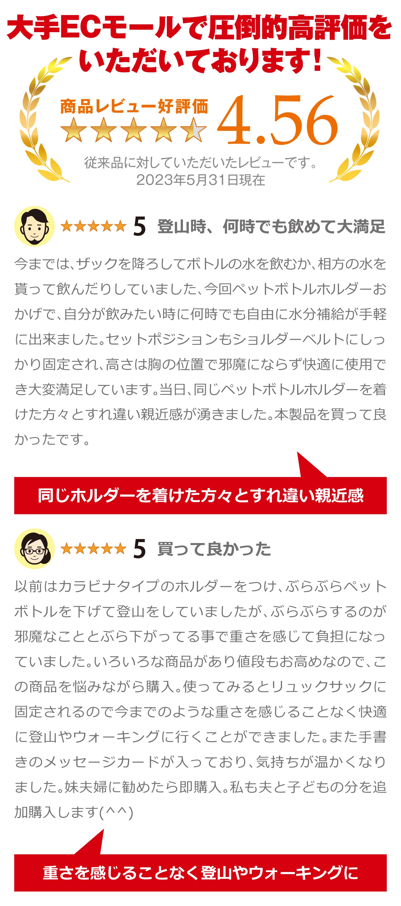背中に背負ったリュックからペットボトルを取り出すのはいちいち大変です。胸元にボトルホルダーがあれば煩わしい作業がなくなり余計なストレスが軽減します。