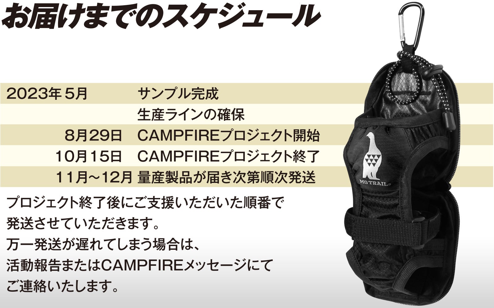 ・ご注文の状況や製造工程の都合で通関手続きや遅延、本プロジェクトで想定を上回るご支援をいただいた場合、出荷時期が遅れる場合があります。その場合はリターン発送遅延の旨をご連絡させていただきます。 ・モニター、スマートフォンの環境により、実際の商品の色と異なって見える場合があります。あらかじめご了承ください。 ・試作からの量産品となりますので、検品が足りず多少の傷、縫製用の目印などがある場合があります。お送りした製品に不備がある場合はご対応させていただきます。 ・開発中の製品につきましては、サイズ・デザイン・仕様が予告なく変更になる可能性がございます。 ・本プロジェクトの実施において十分確認は行なっておりますが、類似品が発覚する可能性がある点、ご了承願います。 ・世界的な新型コロナウイルスの感染拡大により予期せぬ事態が予想されますが、弊社は最大限の努力をし、サポーター様のもとに商品をお届けするために尽力いたします。 ・弊社が掲載している全ての文章、画像等内容の無断転載及び複製等の行為は禁止します。 ※原則として、配送遅延に伴うご支援のキャンセルはできませんが、リターン配送予定月から6ヵ月を超えた場合には、希望者に限りキャンセルにて対応させていただきます。 ※本文中に記載させていただいたスケジュールは、あくまでプロジェクト公開時点の予定です。 クラウドファンディングの性質上、配送遅延のおそれがございます。