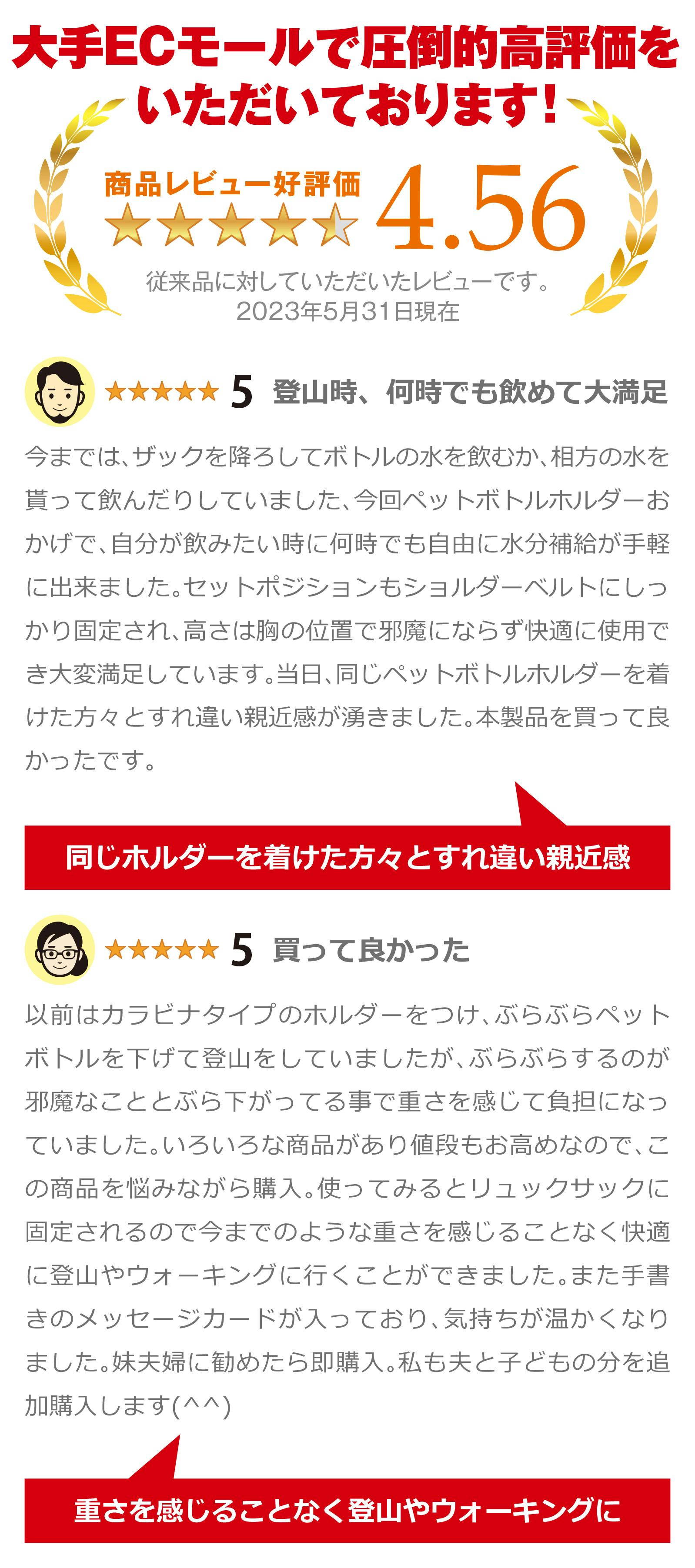 登山は自分の五体を使って山を登っていきます。そのため小さな行動でも体力を消耗します。装備を取り外したりするチョットした動きがスムーズにできるようになればと思いペットボトルホルダーを製作しました。今回のリニューアル版もぜひ皆様に使っていただき、素敵な山登りライフをお過ごしいただければ嬉しく思います(^^