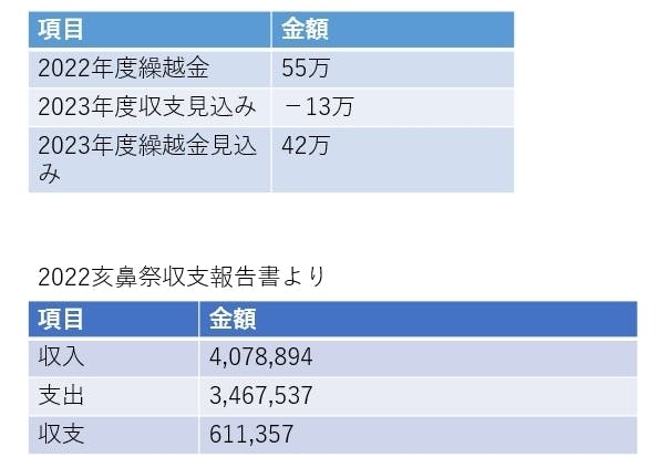しかし、当日の盛り上がりとは裏腹に140万円ほどあった繰越金は55万円まで大きく減少してしまいました。今年度はお笑い芸人の方などのゲストステージを断念するなど経費削減に努めました。しかし、それでも今年度の繰越金見込みは40万円と、赤字予想となっています。