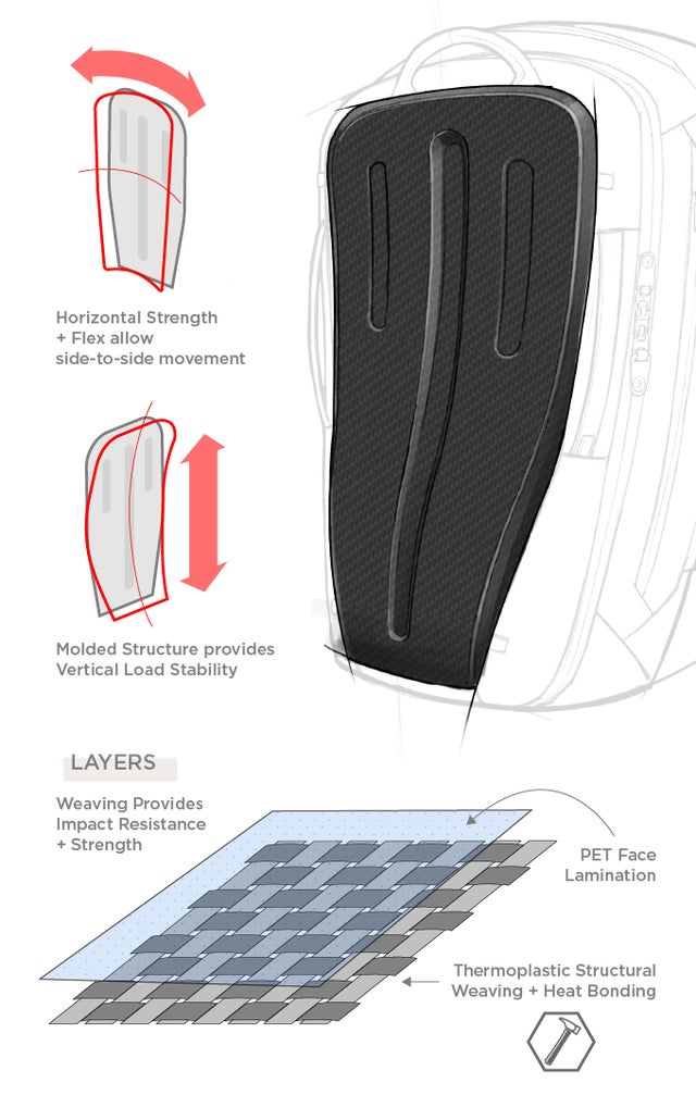 また、背板は、ドイツで設計されたCURV複合フレームシートの背面パネル人間工学に基づいてドイツで設計された、誰でも背負いやすい背面フレームを使用しています。