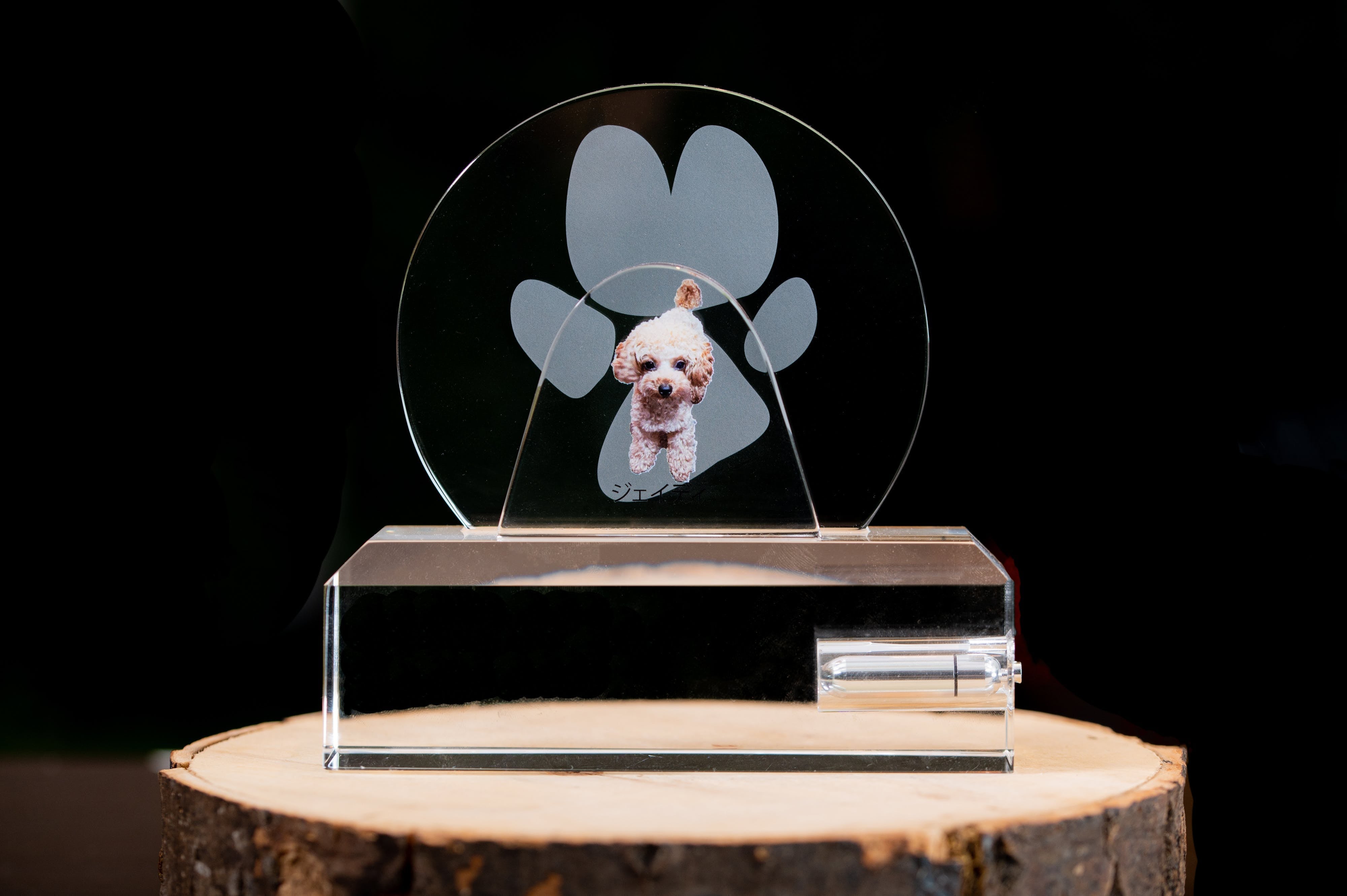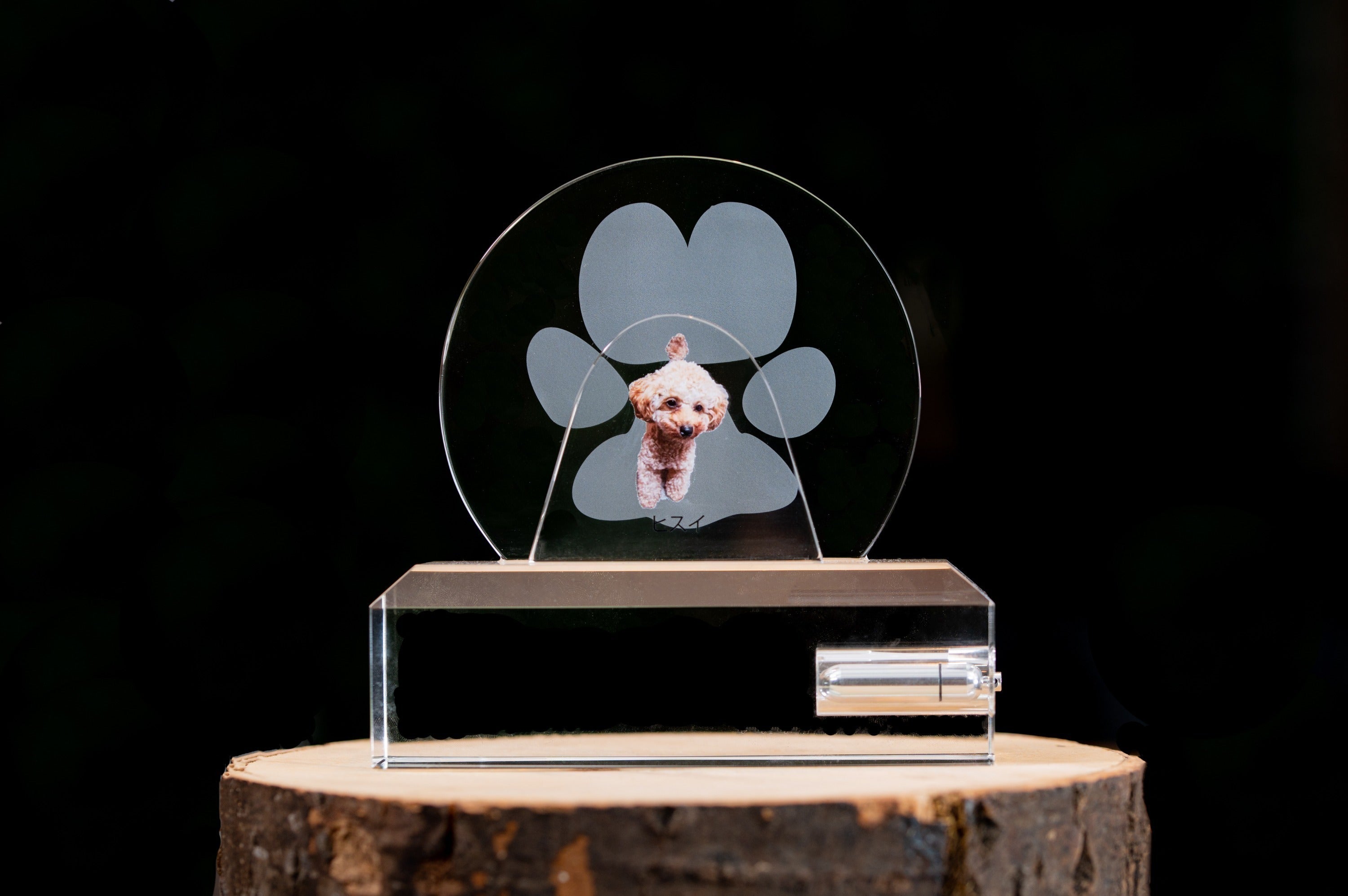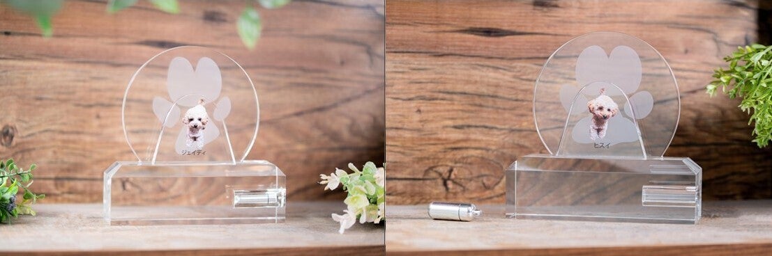 「Heart to Message」の【to Memory】は、クリスタル素材に大切なペットの写真をUV加工、肉球や手形などを2D加工するモニュメント。