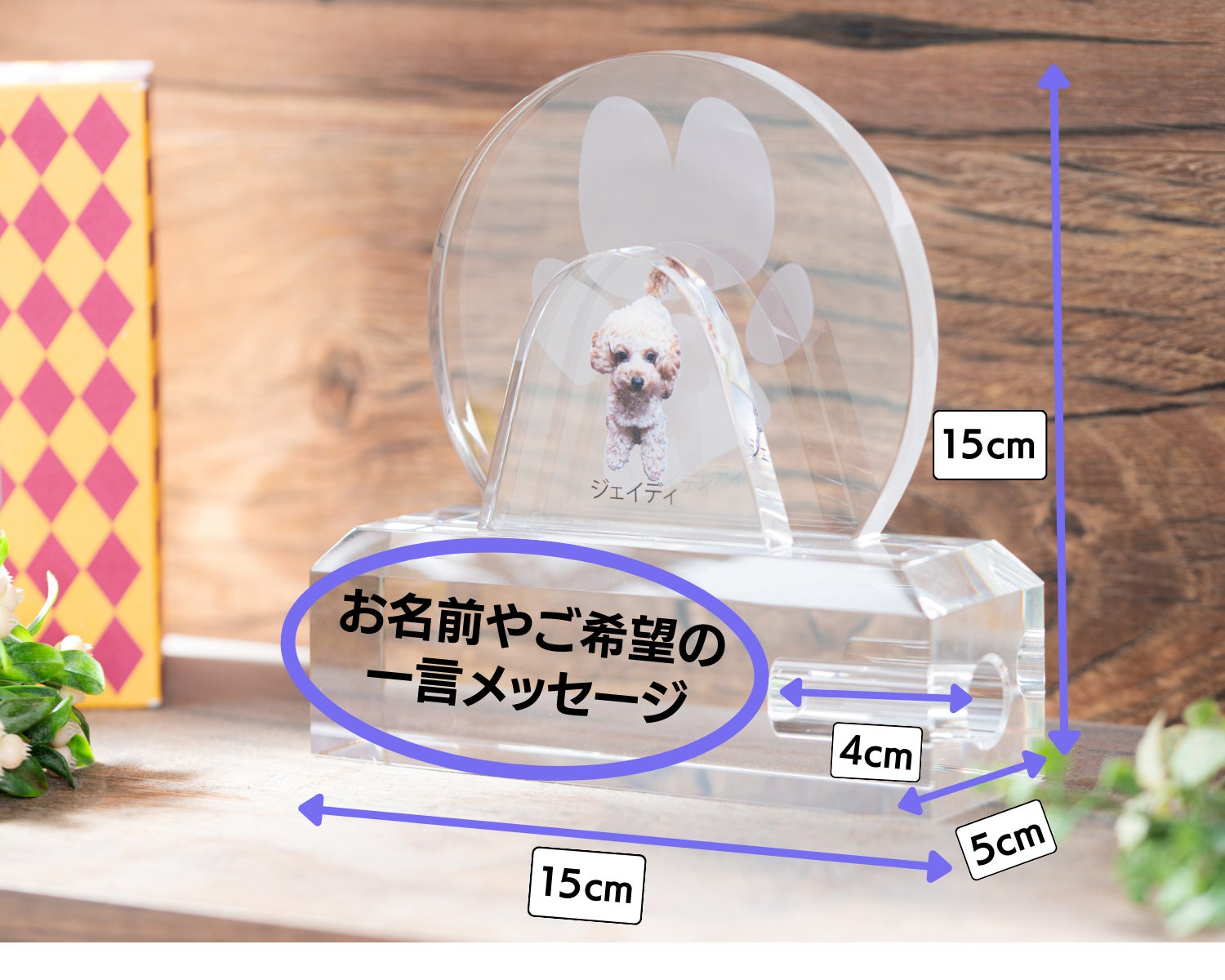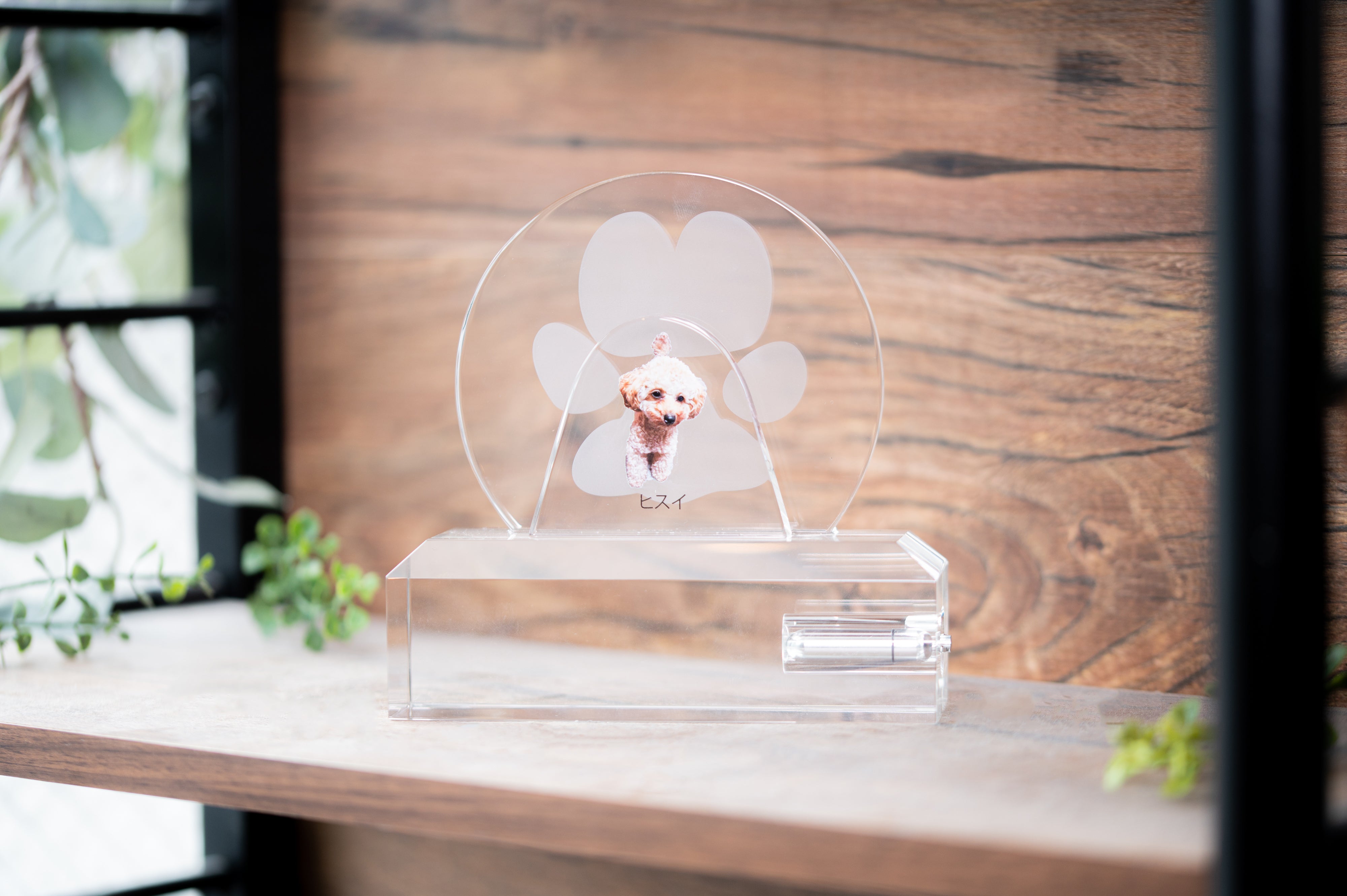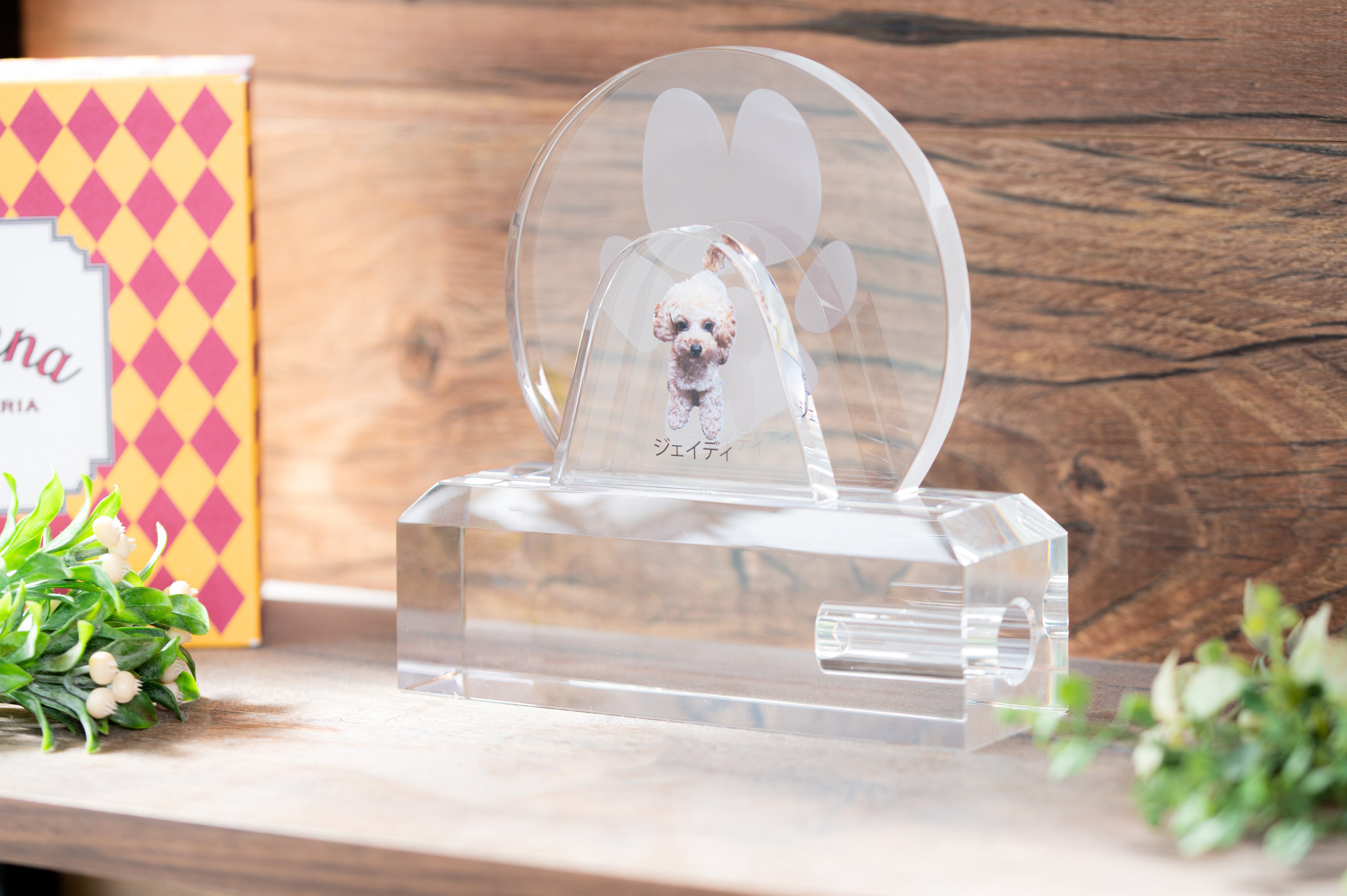 「Heart to Message」の【to Memory】は、クリスタル素材に大切なペットの写真をUV加工、肉球や手形などを2D加工するモニュメント。
