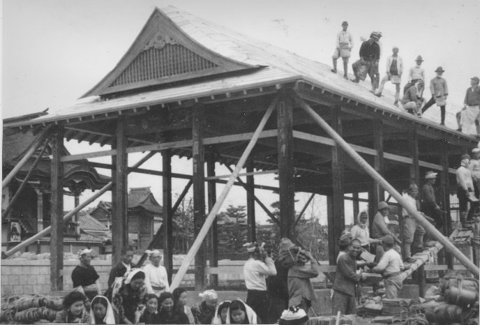 昭和17年という大変な中、曳き家工法で旧社地より運んで頂いている様子です。