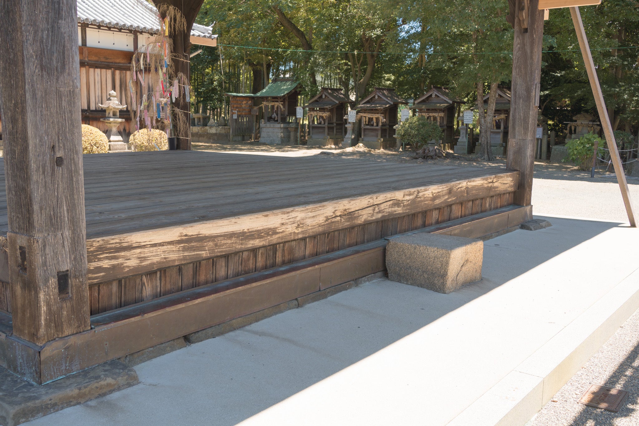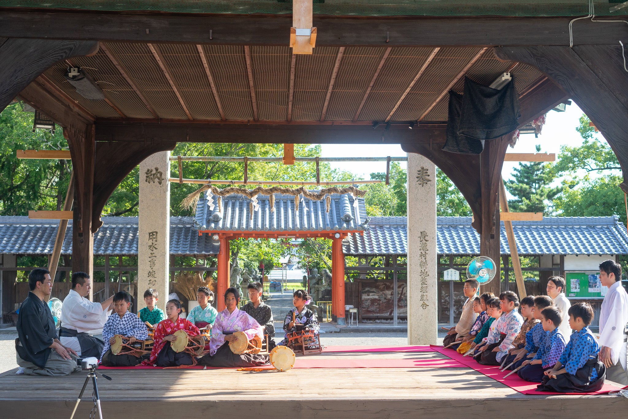 舞殿を備えた神社は格別です。だんじり祭には子ども巫女が神楽を奉納し、あるときは能やミニコンサートの舞台になり、観光案内のボランティアさんが由緒の紙芝居を披露し、また真夏の参拝のかたが屋根の下に腰を下ろして涼を取るなど、この舞殿があることで人々が集い、村の氏神鎮守社として人々と神社とをつなぐ大切な接点となっているのです。