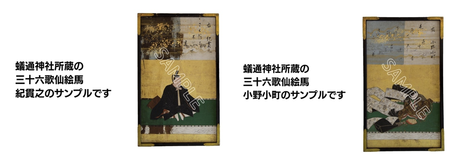 江戸時代に蟻通神社に奉納された三十六歌仙の絵馬のうち「紀貫之」「柿本人麻呂」「斎宮女御」「小野小町」をデータ化し”実寸大”に印刷したものを額装付きで提供いたします。
