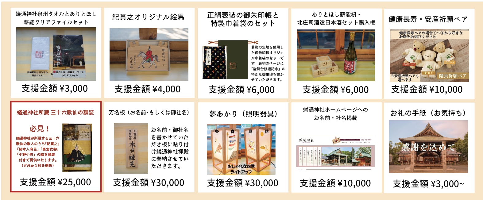 当神社所蔵の品や地域の企業様とのコラボによりクラウドファンディング限定の品などさまざまなリターン品をご用意しております。以下抜粋してご紹介いたします。