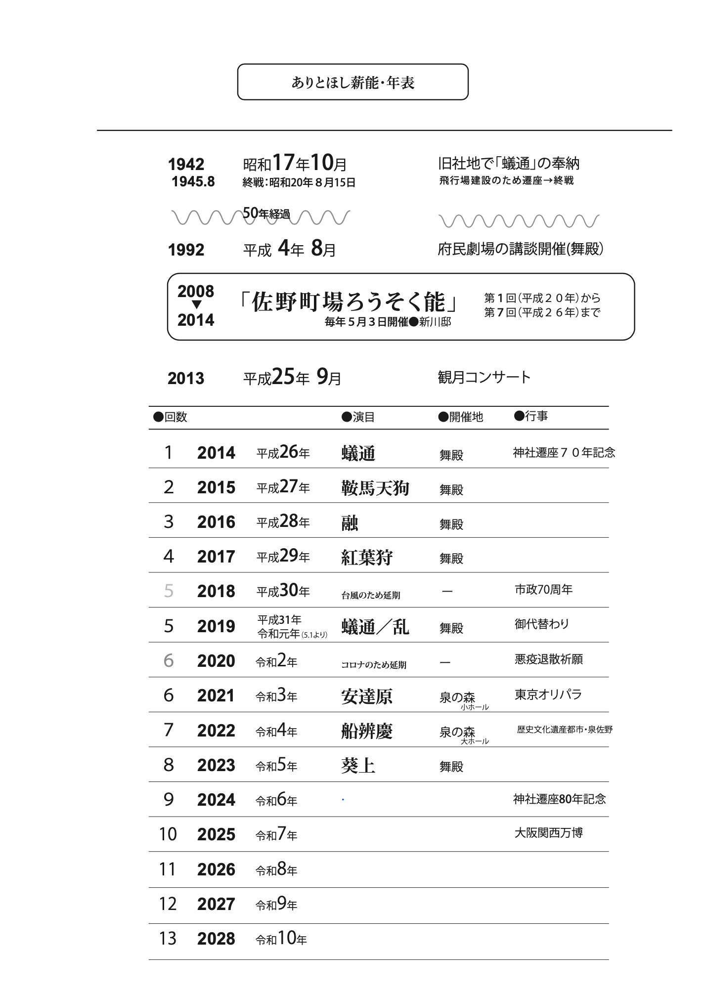平成26年、遷座70年を記念して70年ぶりの能を奉納しようと「ありとほし薪能実行委員会」が発足し、蟻通神社の舞殿をお借りして、「蟻通」を上演申し上げました。それから10年間、台風やコロナでの中断もありましたがなんとか継続し、ことしで第8回となる「ありとほし薪能」を、この舞殿で開催できました。