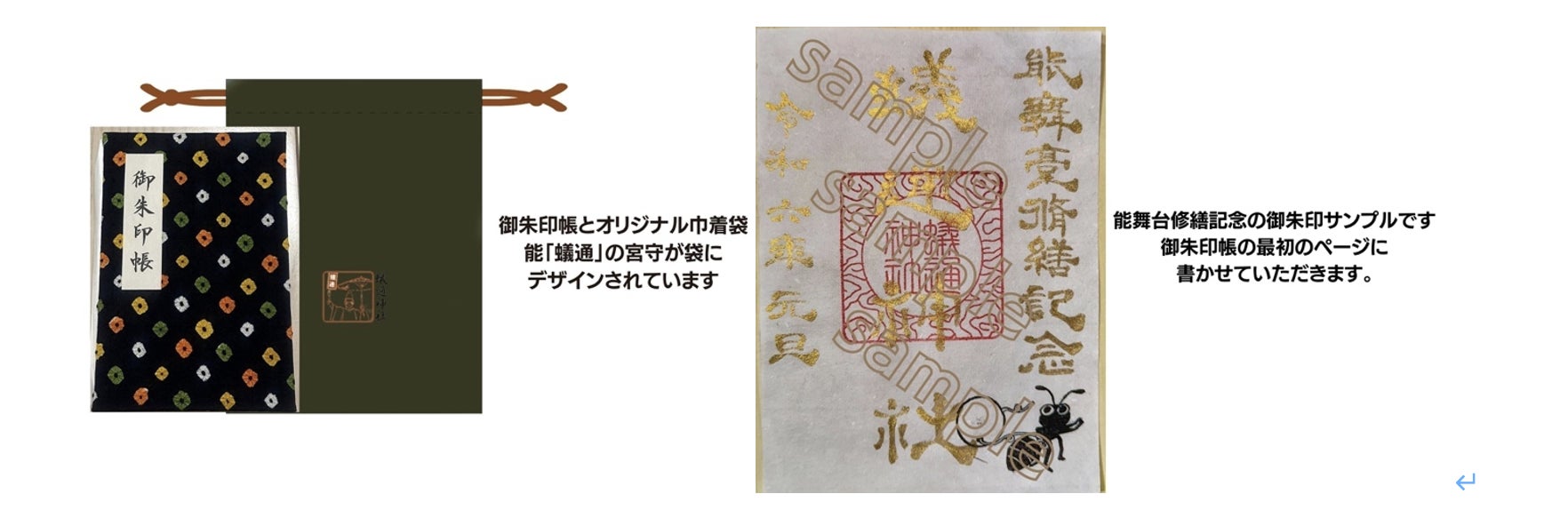 北浦呉服店様のてづくりによる着物の生地を使用した1点もの御朱印帳です。 巾着袋には能「蟻通」に登場する宮守がデザインされております。 御朱印帳の最初のページに「能舞台修繕記念」の特別な御朱印を書かせていただきます。