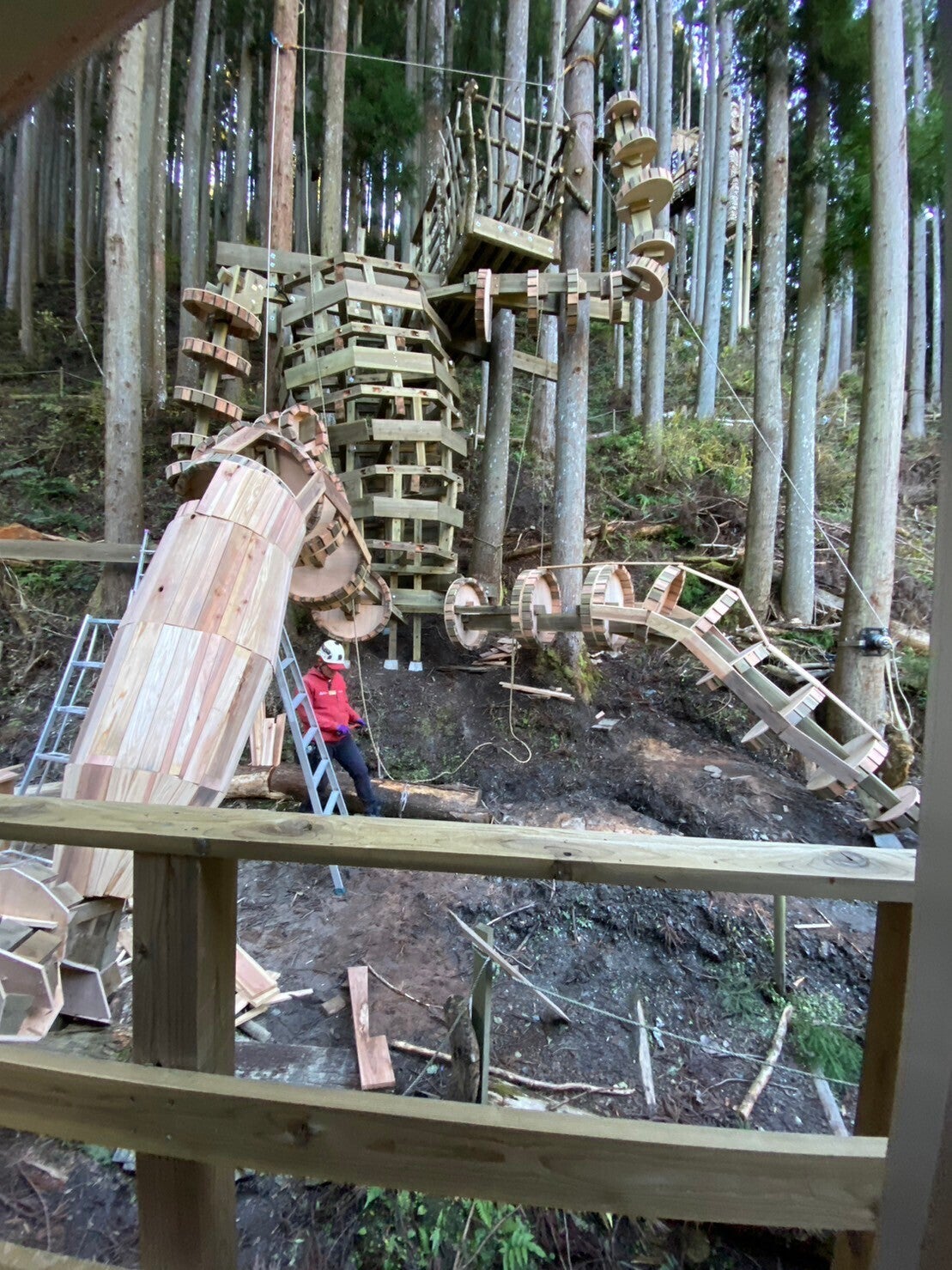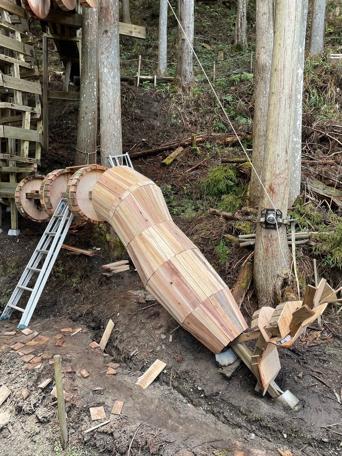 当初12月に完成を予定してましたが、他の仕事の兼ね合いで完成はもう少し先になりました。骨格が浮かび上がり肉付け作業をしております。フォルム的には斜面に腰かけた巨人で、肩に人を乗せた籠を載せています。