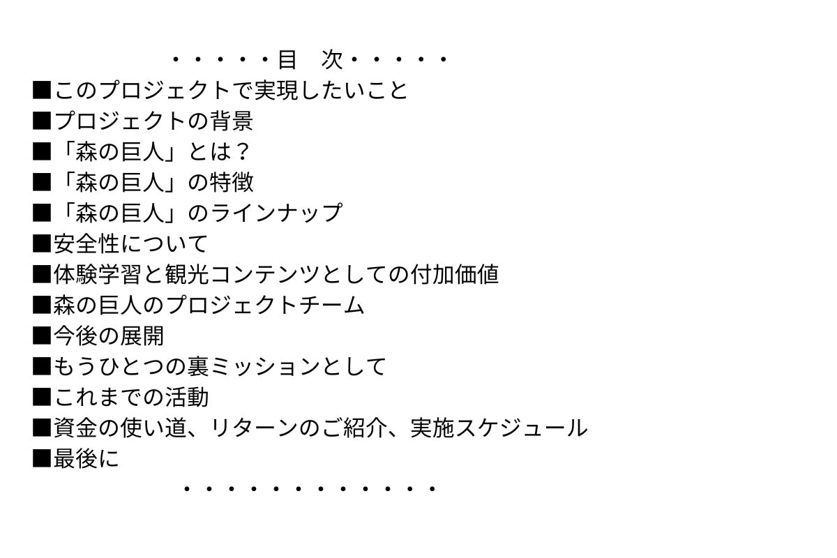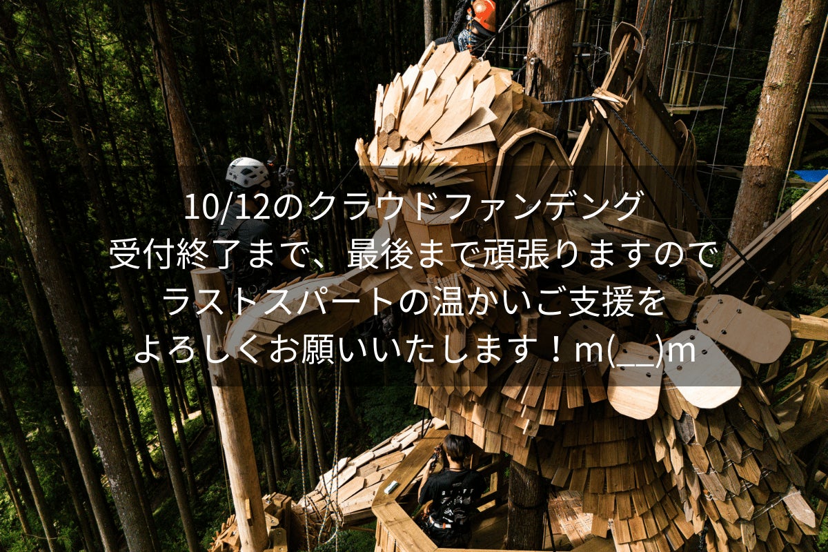 またこの巨人は森林整備で間引かれる間伐材や使われなくなった廃材が主な材料ですので、ご支援いただける皆様には、環境課題の改善や地域資源の有効活用、また新しい観光コンテンツの創造を担うという想いを共にしていただければ大変ありがたいです。