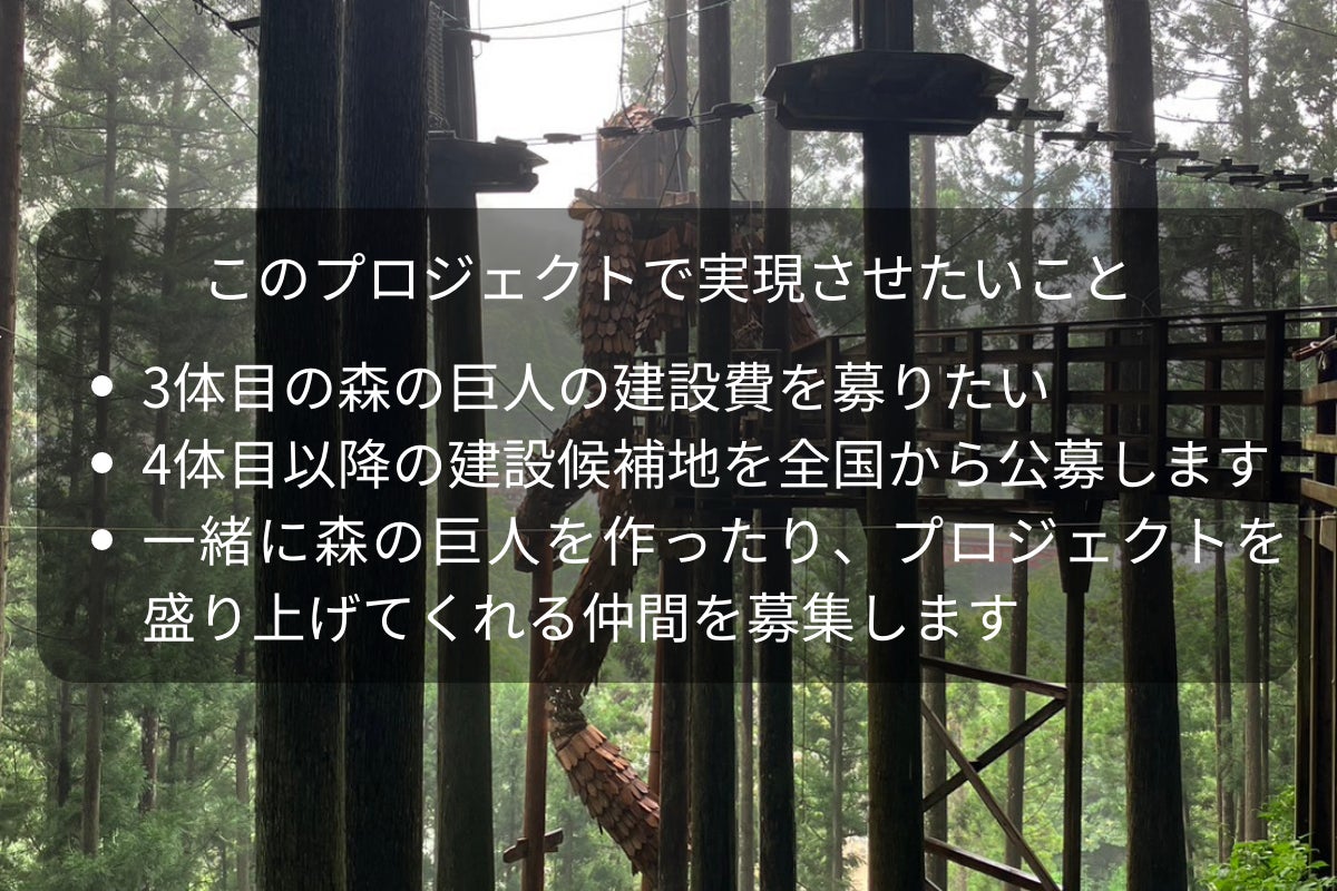 このプロジェクトでは、現在2体の森の巨人が完成しているので3体目を作るための建設費をご支援いただきたいと思っています。森の巨人3号は徳島県三好市、または愛媛県西条市を候補地(共に自社で管理している山林)にしています。