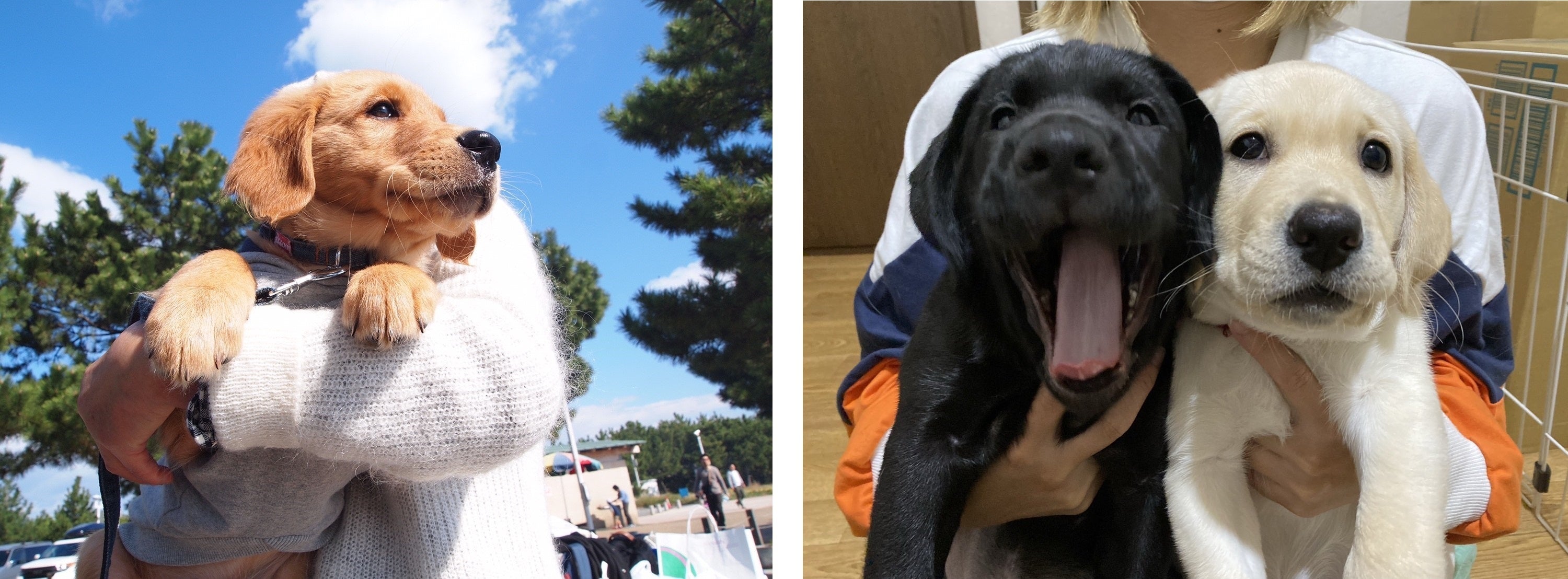 ・介助犬候補の子犬を抱っこして記念写真の撮影