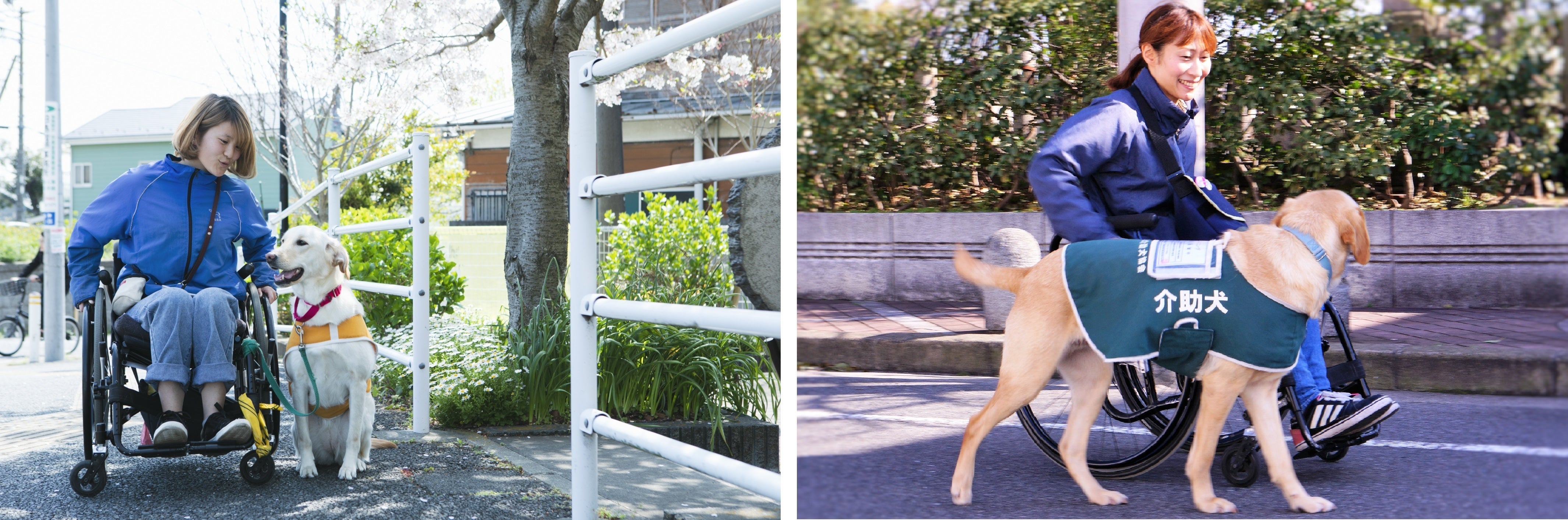 介助犬が車椅子を引っ張って段差を乗り越えるお手伝いをすることで、一人で外出できるようになる人もいます。