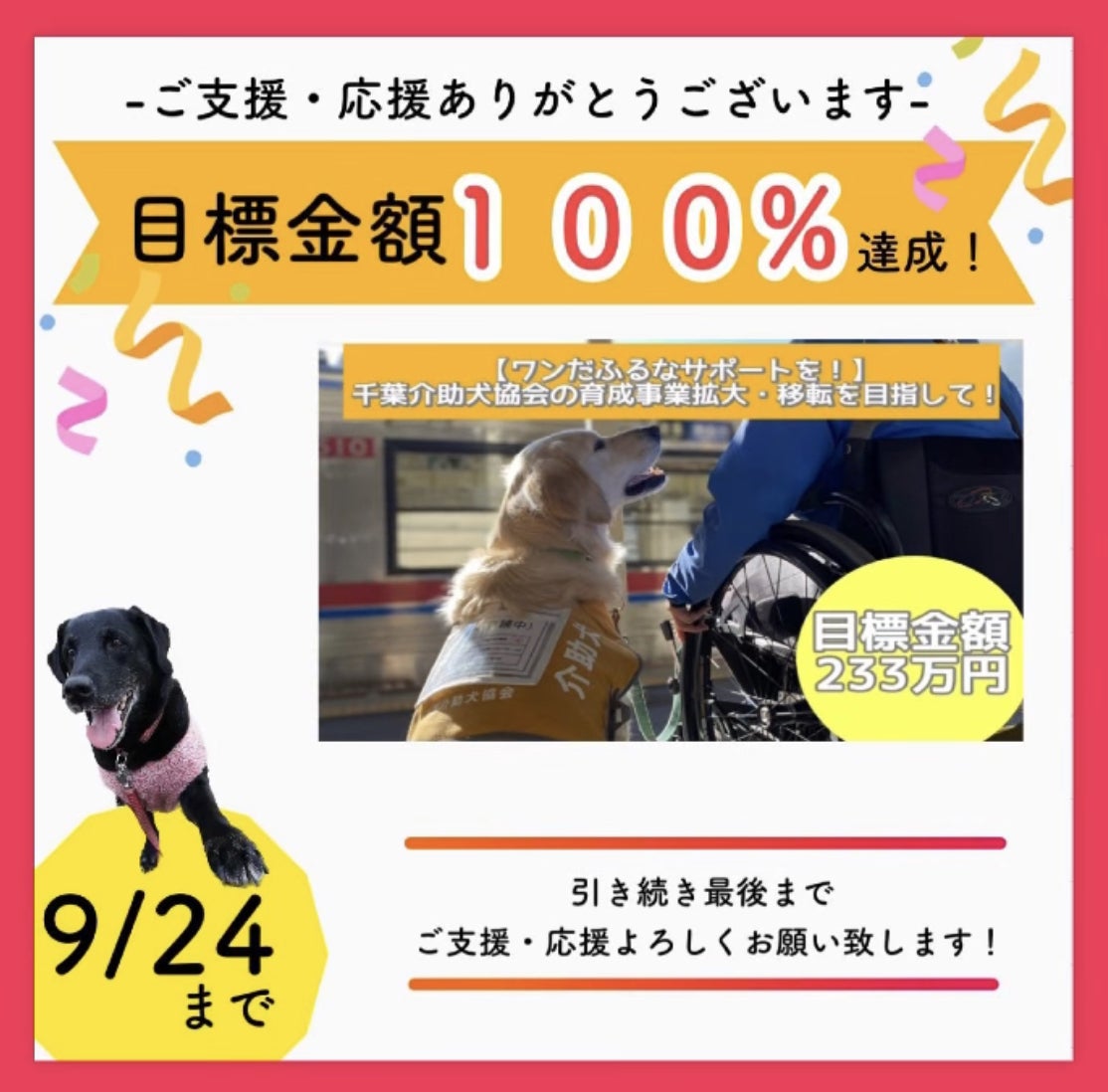 活動報告をご覧頂きありがとうございます!9/17 12:00時点目標金額の90%を達成しました。残り7日間最後まで頑張ります(^^)!まずは、目標達成を目指します!その後、ネクストゴールを立て協会の犬たちの育成費用に活用させて頂こうと考えています!最後までよろしくお願いします。