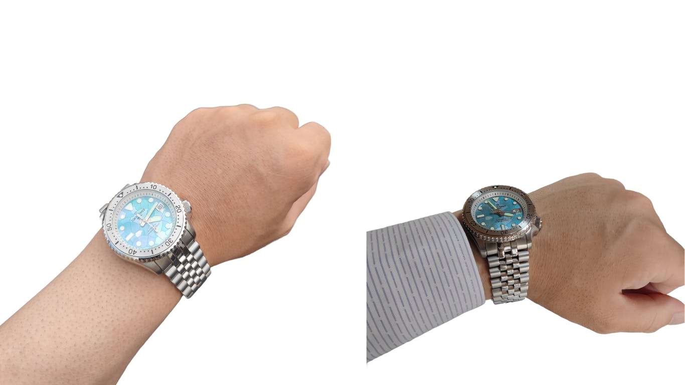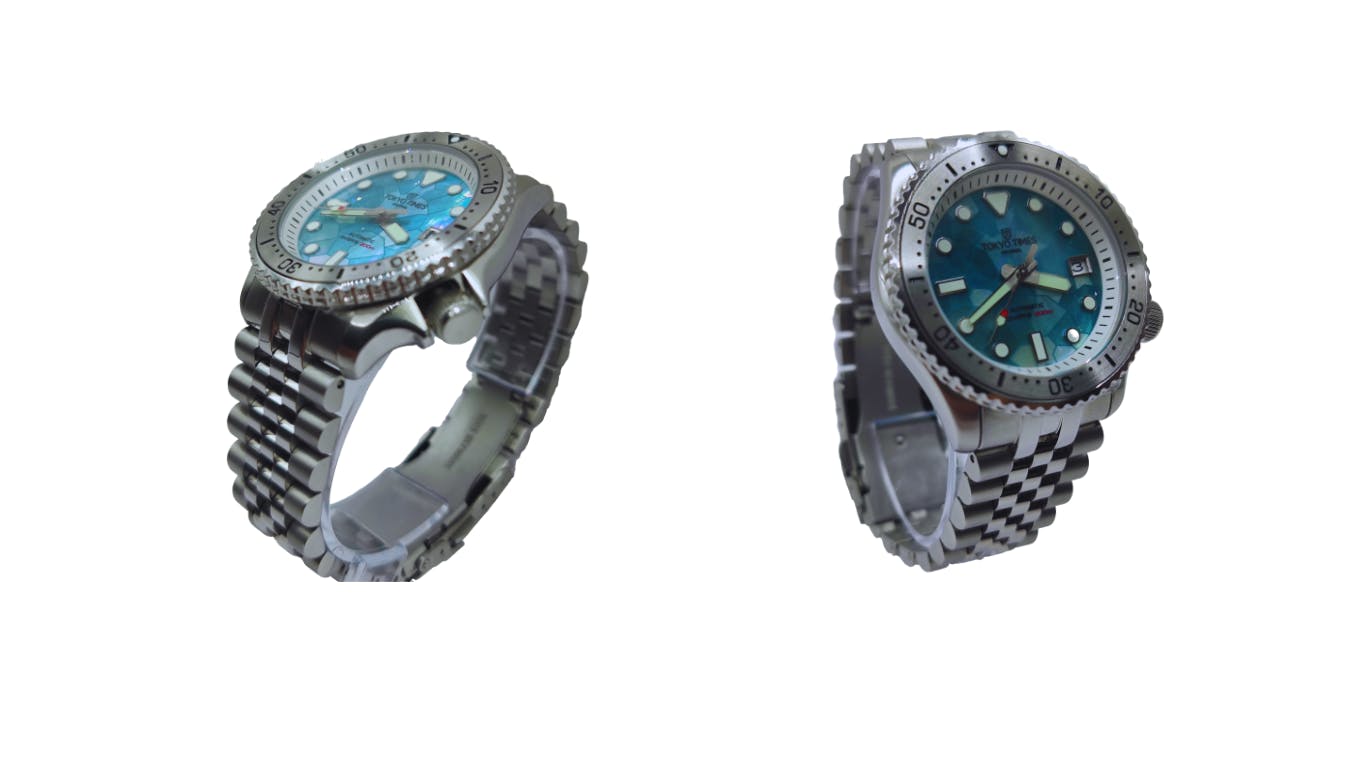 深海の美しさを思わせる、アイスブルーの文字盤が魅力のダイバーズウォッチ。20ATMの防水性能と、精密な120クリックベゼルを備え、高級時計にも使われるステンレスやガラスも使用。実用性とデザインの両方を追求し、日常使いから本格的なダイビングまで対応。一年中あなたの腕元を爽やかに彩ります。