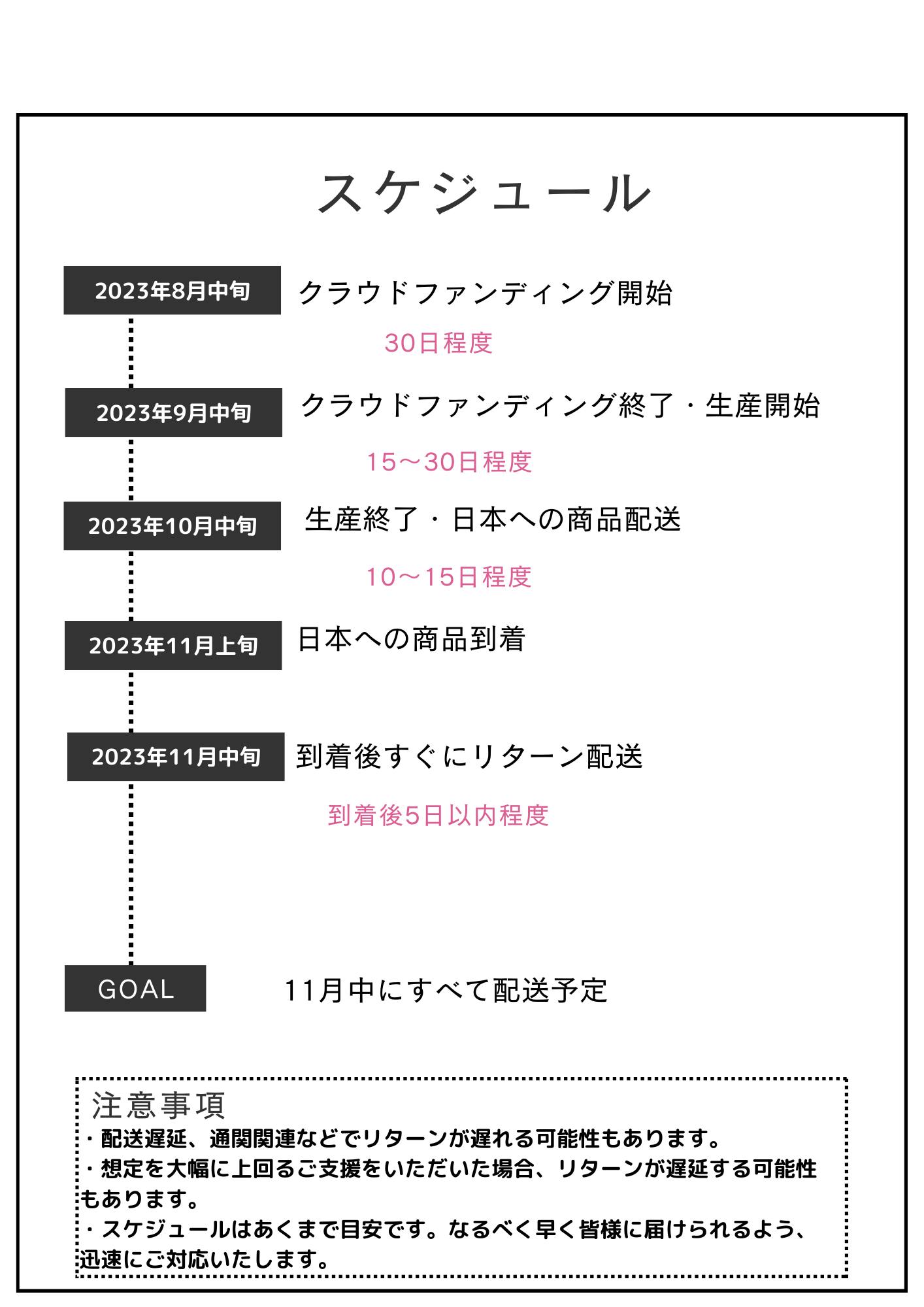 スケジュールについては、プロジェクト公開時点の予定となっております。配送遅延や通関関連等で遅れが発生する可能性がございます。