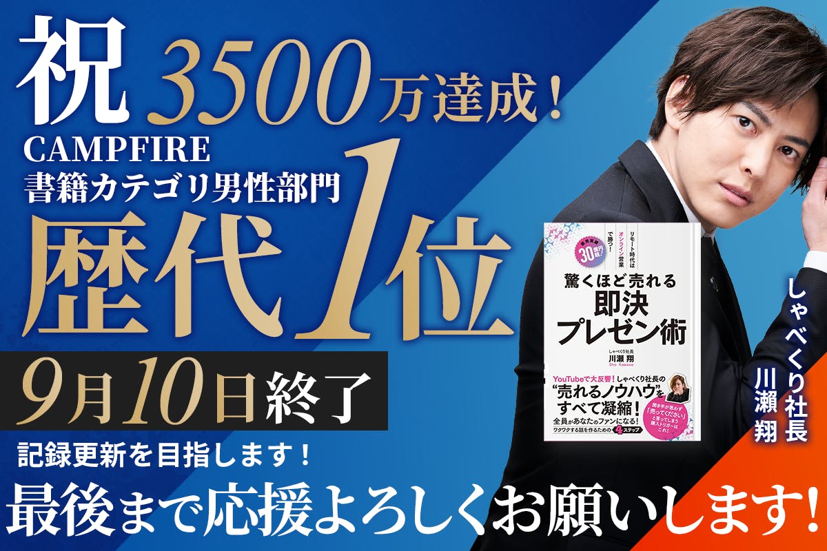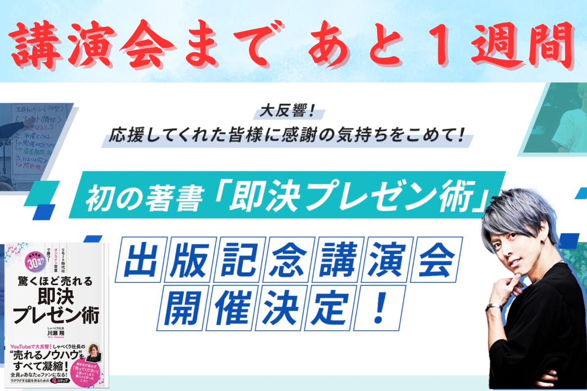 2023/10/21 23:01出版記念講演会まで残り7日ー!!講演会の詳細はこちらどうも、しゃべくり社長こと、川瀬翔です。クラウドファンディングが終了してから約1ケ月が経ちました!みんなのお陰で最終的には5,300万以上の支援が集まり、CAMPFIRE書籍カテゴリの男性部門記録を更新しました!!ほんま有難う!!各SNSではお礼できてたねんけど、ここでは感謝の発信ができてなかったので、改めて皆さん、本当に有難うございました!!みんなから支援していただいたお金は・出版費用・配送費・広告費・TV出演費そして、来週に迫った「出版記念講演会」に使わせていただいています!!今回のおれの目的は、本を売ることでも、クラファンで記録を作ることでもなく、、、一人でも多くの「子供心を忘れたオトナ」へ人生にワクワクする大人を一人でも多く作り次世代の子供にいい影響を与える社会を作る!ってのが目的!!だからこそ、まずはその想いを来週の出版記念講演会で伝える!!盛大な講演会を開催しておれの熱い想いをひたすら話すから是非来てほしい!講演会では「裏TED」と称して日本語版TEDトークをするよー!!詳しい内容は下記ページから見れるのでぜひ見てみてー!みんなに会えるのを楽しみにしてる!講演会の詳細はこちら もっと見る