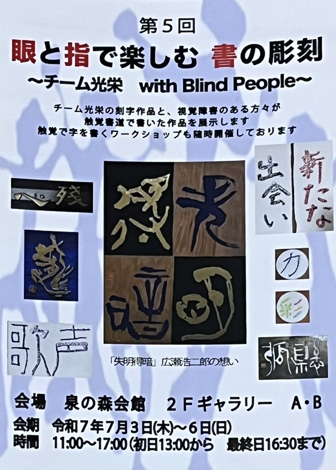2025/06/17 23:06日頃より触覚書道の活動をご支援いただき有難うございます。本年も、東京都障害者福祉会館で開催した触覚書道刻字講座の受講生の視覚障害の方々の修了作品と私どもの刻字のコラボ展を下記要領で開催いたします。書を触って感じる新しい体験型の展示となっておりますので、是非お越しいただければ幸いです。*****グループ展のご案内 ********* 私達 一般社団法人触覚書道刻字協会では 第5回『眼と指で楽しむ 書の彫刻 ~チーム光栄 with Blind People』を以下の要領で開催いたします。 会期:令和7年7月3日(木)~6日(日)時間:11:00~17:00 (初日は13:00から、最終日は16:30まで)会場:泉の森会館 2FギャラリーA&B (小田急線狛江駅北口1分)http://izumino-mori.net/ TEL:03-5497-5444■会場内の作品は、すべて触っていただけます。■会場内にて「触覚書道」の無料ワークショップを随時開催します。 グループ展では、チーム光栄の刻字作品と、東京都障害者福祉会館で視覚障害の方を対象に開催している「触覚書道刻字講座」受講者の修了作品を展示します。 今回のグループ展のテーマは 国立民族学博物館教授の広瀬浩二郎先生の造語「失明得暗」です。昨年、その言葉を刻字で彫らせていただくご許可をいただき、年明けに触覚書道の体験もしていただきました。展覧会に向けてのメッセージを頂戴しました。↓ ↓ ↓ (内容はこちら)https://shokkakushodoh.org/2025/06/01/message/ アドバンスクラスの方々が「失明得暗」から感じた想いを触覚書道で書いた作品、主宰者の刻字作品を展示 します。それに加え、受講者が力を合せて盲学校に寄贈するために作成した 「ひらがな五十音」も併せて展示します。 私達は、視覚障害者と晴眼者が手を取り合い、書道を通して心を豊かにする活動を目指しています!皆さまのご来場を心からお待ちしております。お問合せ先一般社団法人触覚書道刻字協会 代表 池山永津子メール:1221ikeyama@gmail.comURL:https://shokkakushodoh.org/>電話:090-2744-0894 もっと見る