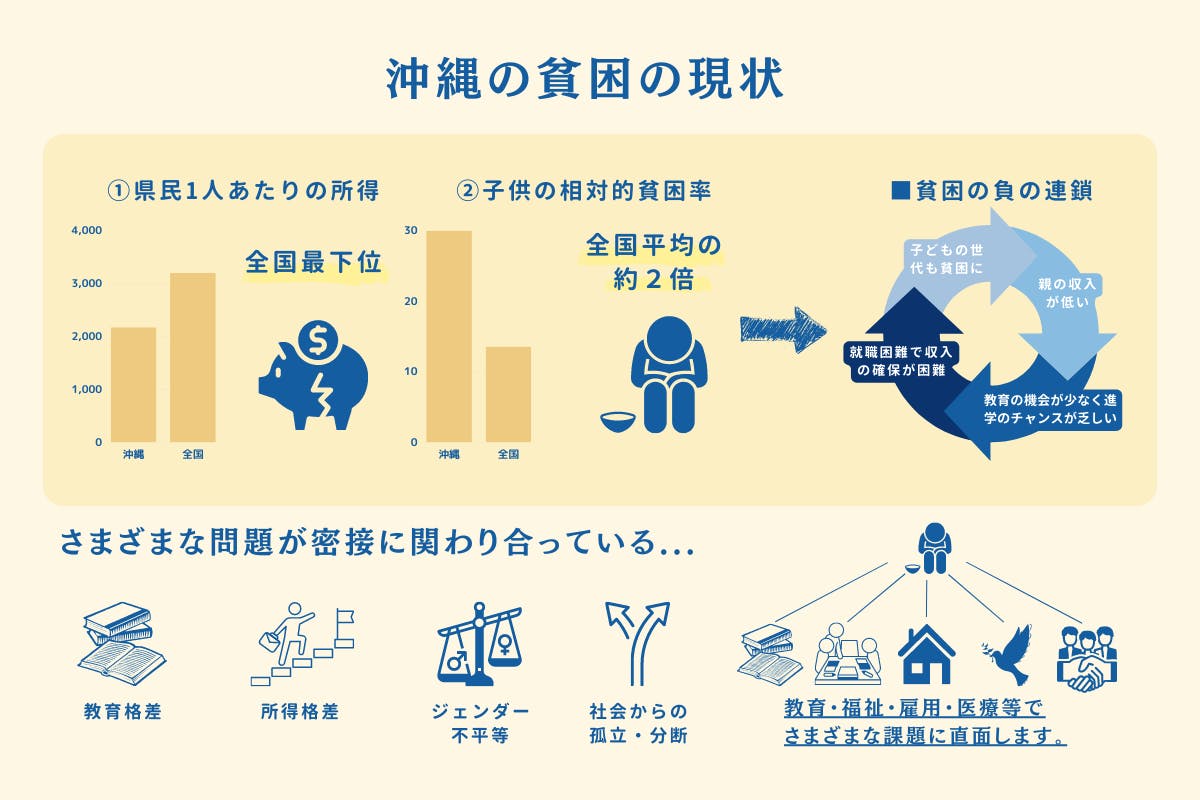 沖縄には多くの社会課題が存在し、その1つとして貧困問題が挙げられます。「内閣府が調査した指標から県民1人あたりの所得が全国最下位であり、子供の相対的貧困率が29,9%と全国平均の約2倍の数字」が露わになり深刻な状況です。