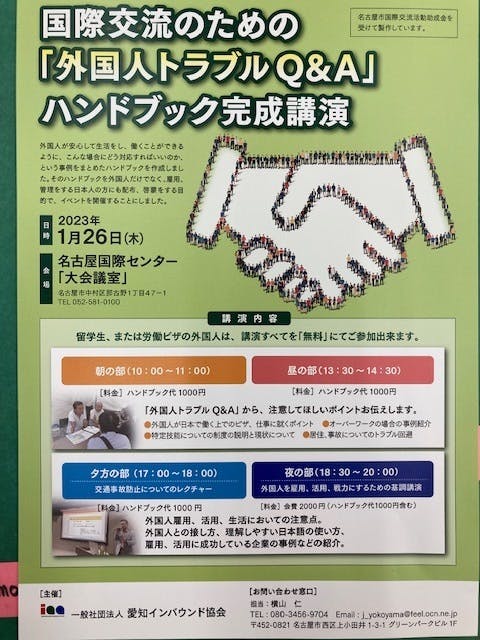 名古屋市国際課の活動助成を受けて、2023年1月26日に、「外国人雇用トラブルQ&A」というハンドブックを作成し、その完成記念講演を開催しました。朝と昼に2回。外国人の方にとっては日本で住み、働く際に注意をするべきことのガイダンス。夜は外国人を受け入れる企業や、支援をしている団体などに向けての講演をしました。