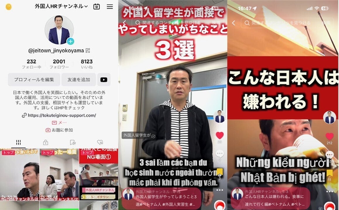 現在は外国人の方が活躍できる社会にしたいという思いから、横山ジンの外国人HRチャンネルという名前で、YouTubeでは外国人の受入れや雇用全般について。TikTokでは外国人を雇用していく上でのあるあるや、豆知識などをあげています。