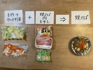 手作りカット野菜、焼きそば、肉、もやし、サクッと5分で『焼きそば』!