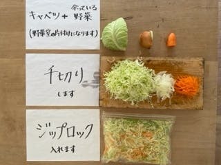 お休みの日や時間のある時に、キャベツと、野菜室に残った野菜(残り野菜の片付けにもなります)を、千切りにしてジップロックに入れます。サラダや付け合わせなどに使います。(100均に真空にするものがあり、保存力が格段にあがります!)