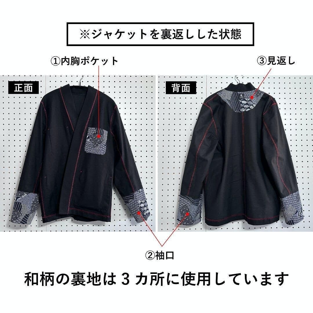 ストレッチ生地で動きやすい羽織風ジャケット。着物の袂をボタンで捲れる機構が付いているので、ビジネスシーンでも邪魔になったら捲って留めるだけ。伝統的な羽織紐を付ける乳(ち)も付いているので気分に合わせた羽織紐を付けても素敵です。ポケット付いてるのでスマホも収納できます。