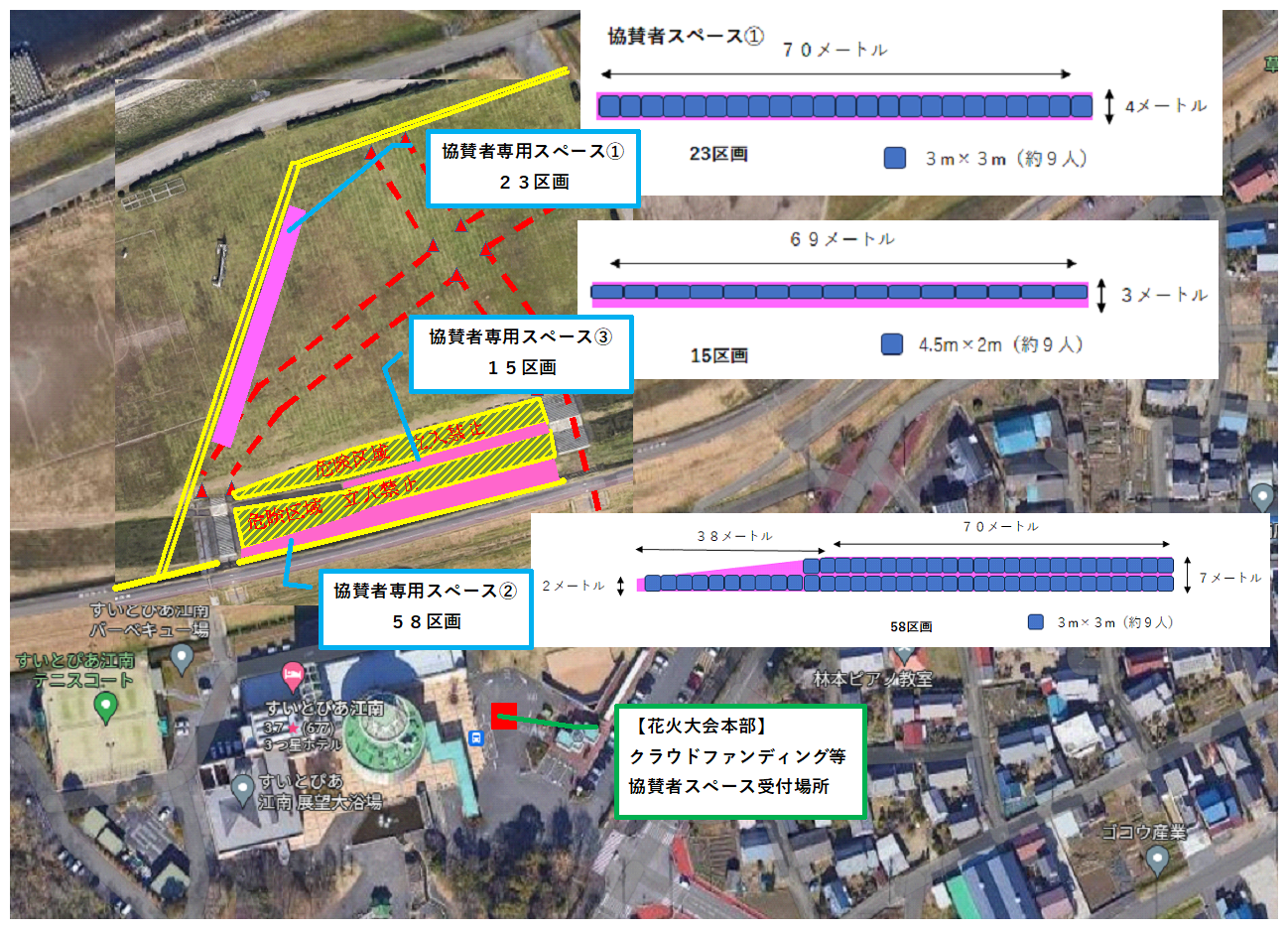 はじめまして。江南花火大会を楽しみにしておりますので支援を検討しております。 当日観覧席予約チケットに関してご質問です。 協賛者用スペースは1〜3まであるようですが割り振りはどのようになるのでしょうか? たとえば、支援順にあわせて1から順に割り振りであったり、当日受付時に先着順で割り振りであったり決められておりますか?