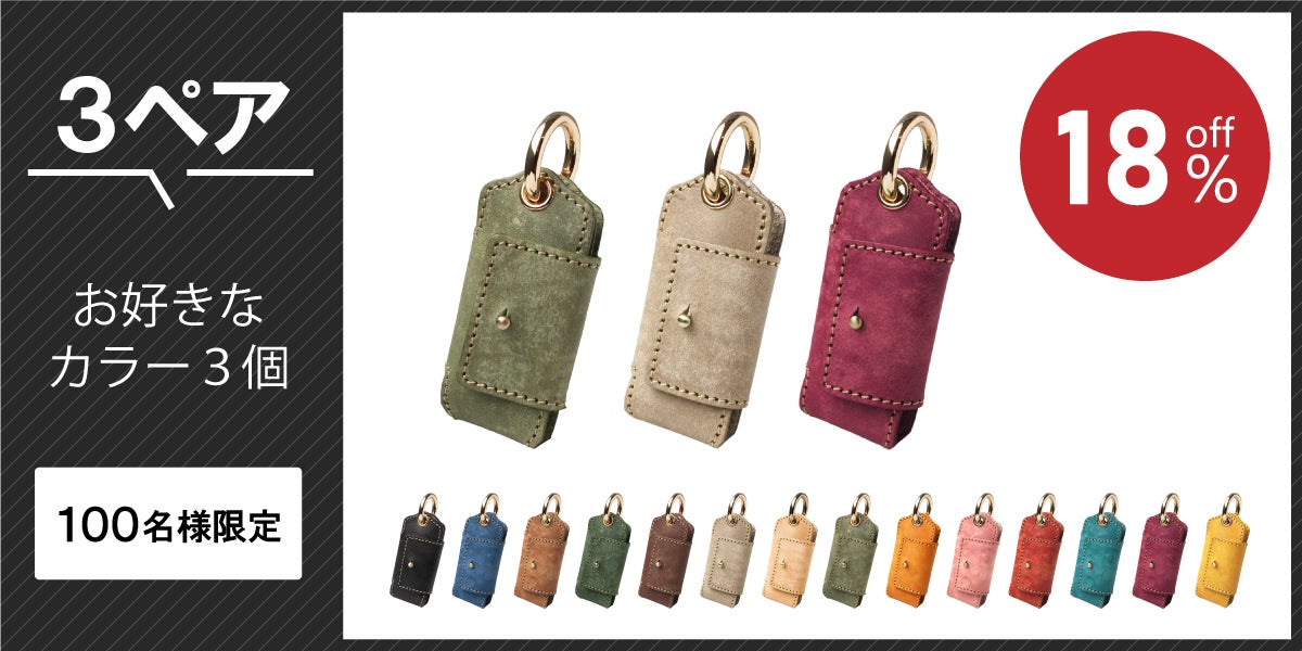 [キーケース:お好みのカラー]×3点【100名様限定】 販売予定価格¥13,200円(税・送料込)のところ、3ペア支援者様限定18%OFFの¥10,800円(税・送料込)にて承ります。 ■お届け予定:2023年11月末までに発送 ※全て国内工房にてハンドメイドで仕上げている為1日に作れる数が限られており納期が11月末となってしまう事ご了承ください。