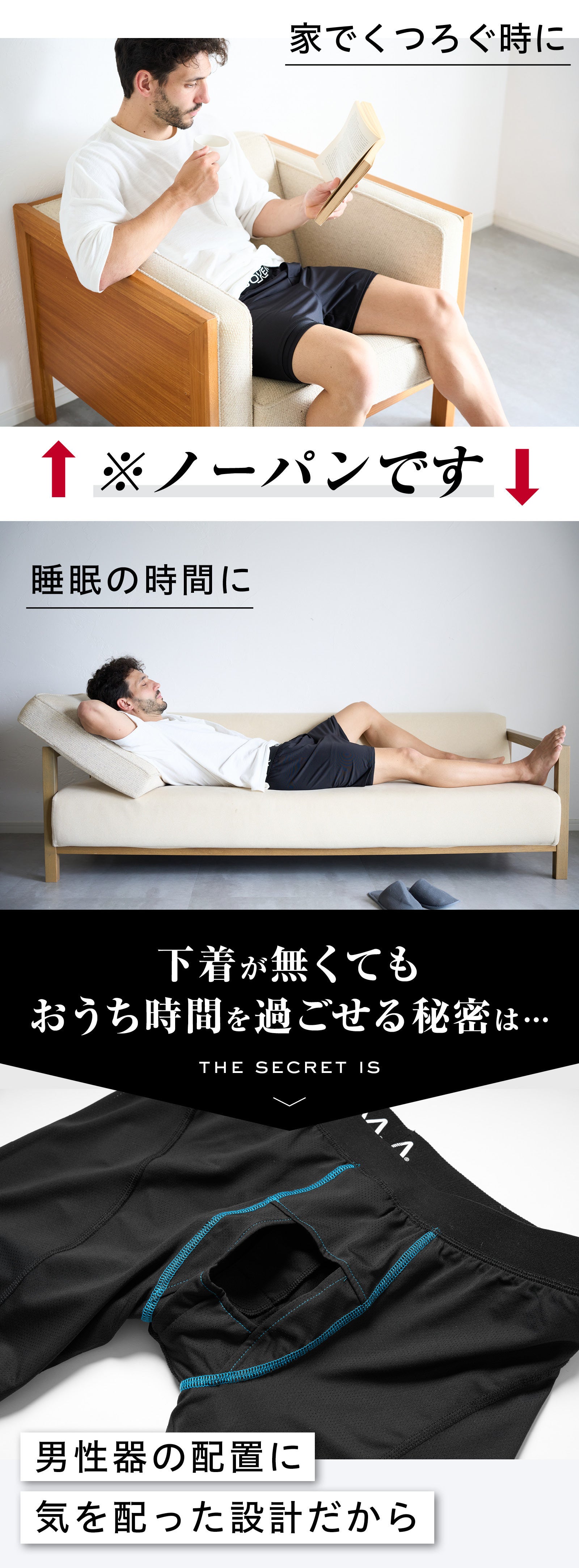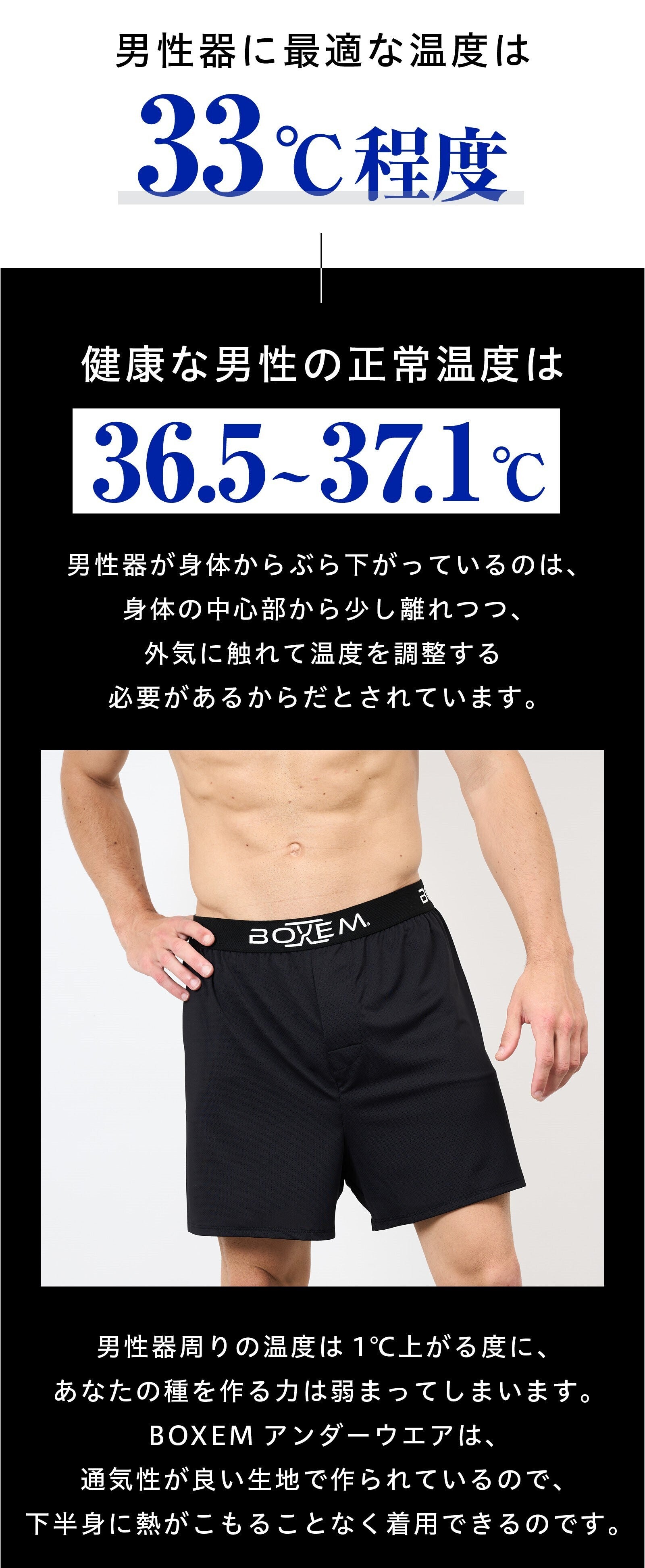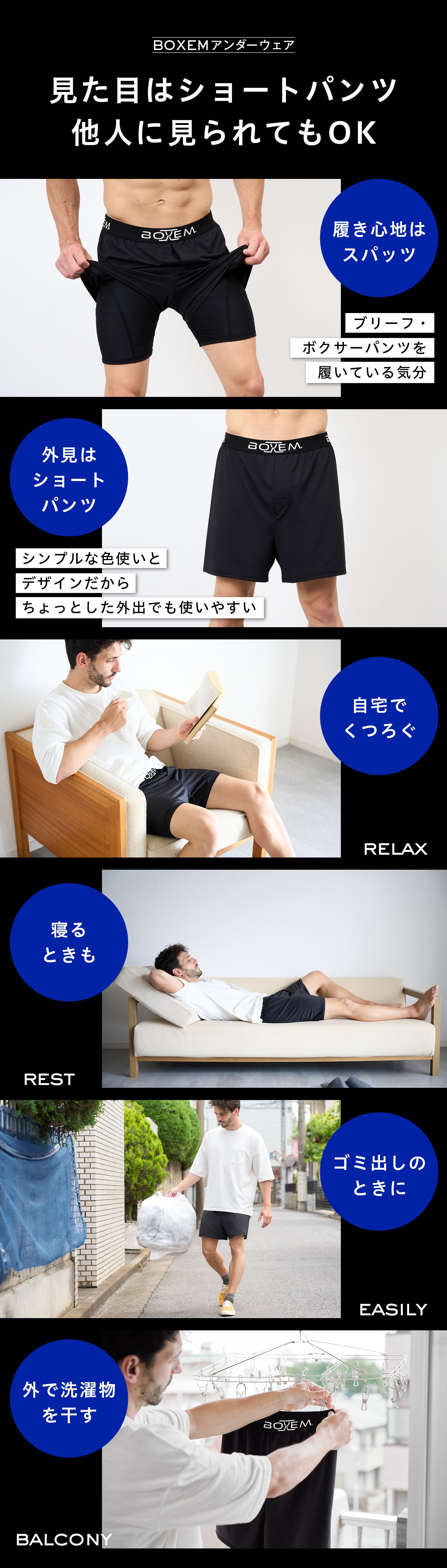 BOXEMアンダーウェアは「下半身に休息を与える部屋着」をコンセプトに作られた男性用アンダーウェア。あなたの下半身を、窮屈な下着から解放してくれる部屋着です!