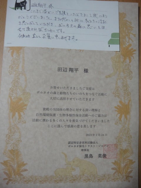 ボルネオ保全トラスト・ジャパンからの礼状。