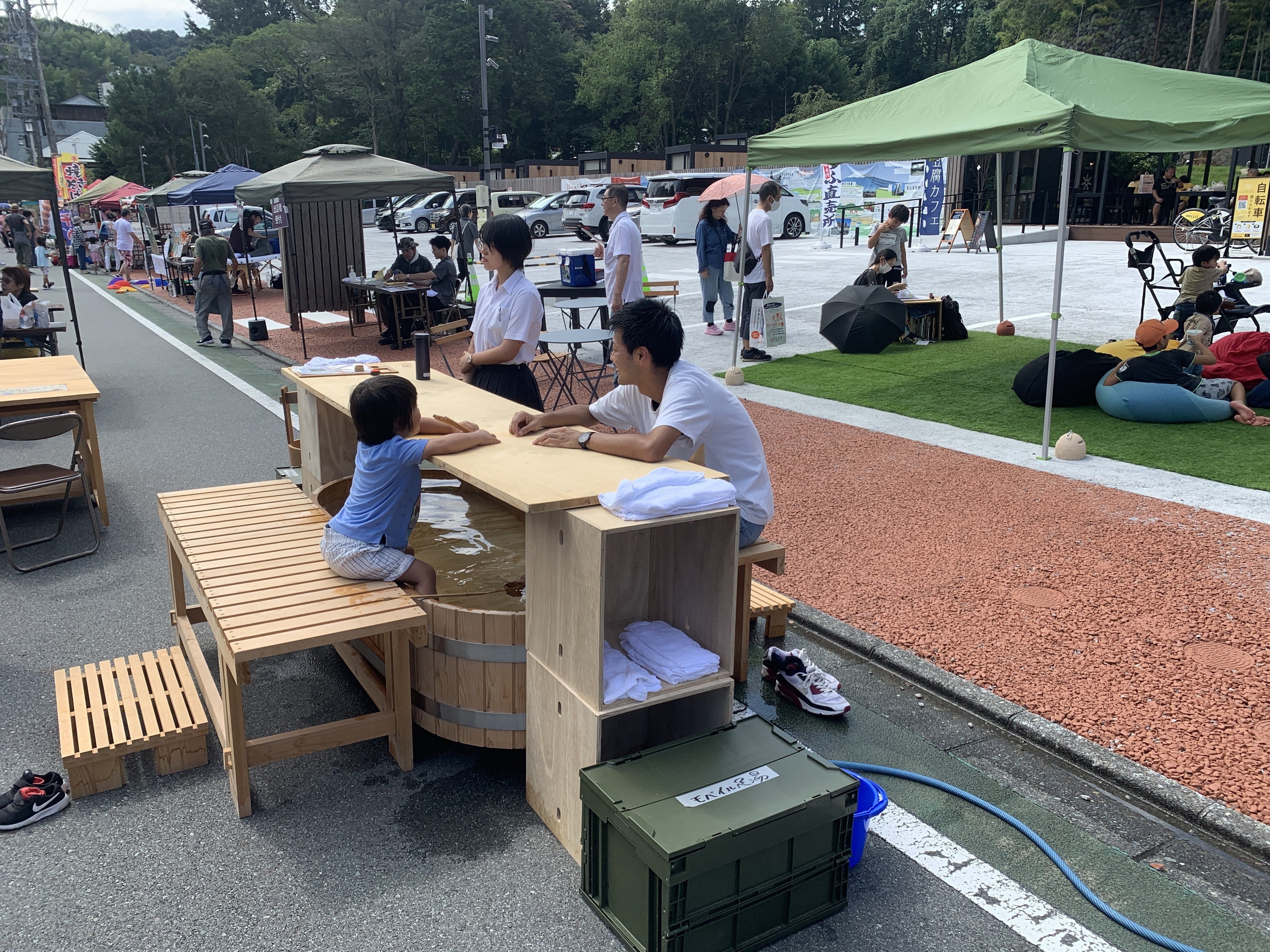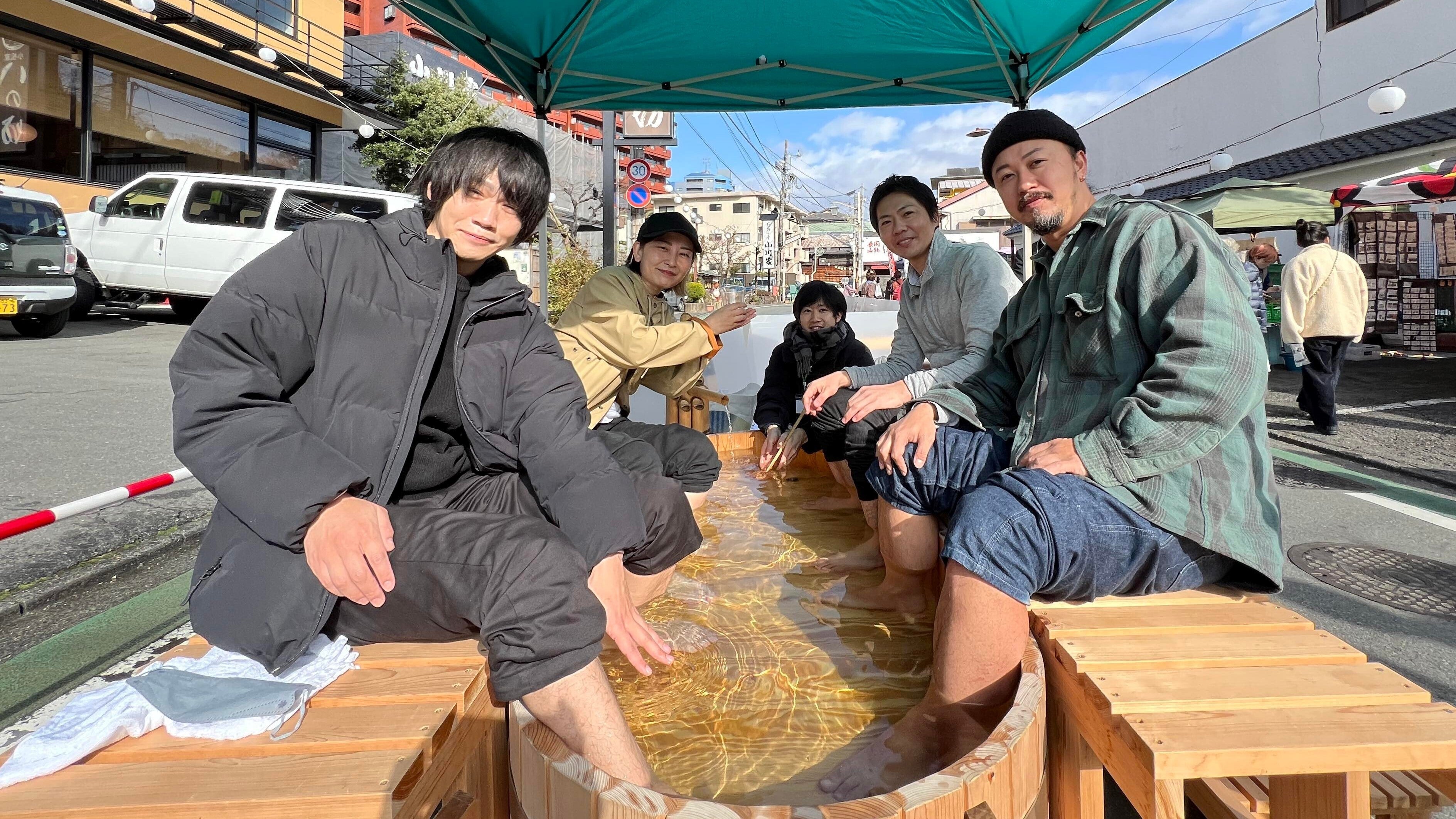お散歩市では毎回伊豆長岡温泉の掛け流し湯を使った足湯を出しています。ここに足を浸しながら、お酒を飲みながら語り合えるこの地域ならではの美味しいお酒があるとお散歩市も盛り上がるのではないか、もっと多くの人や地元の方に親しんでもらうためのお酒があると面白くなるのではないか、そんな議論している中で生まれた企画でした。