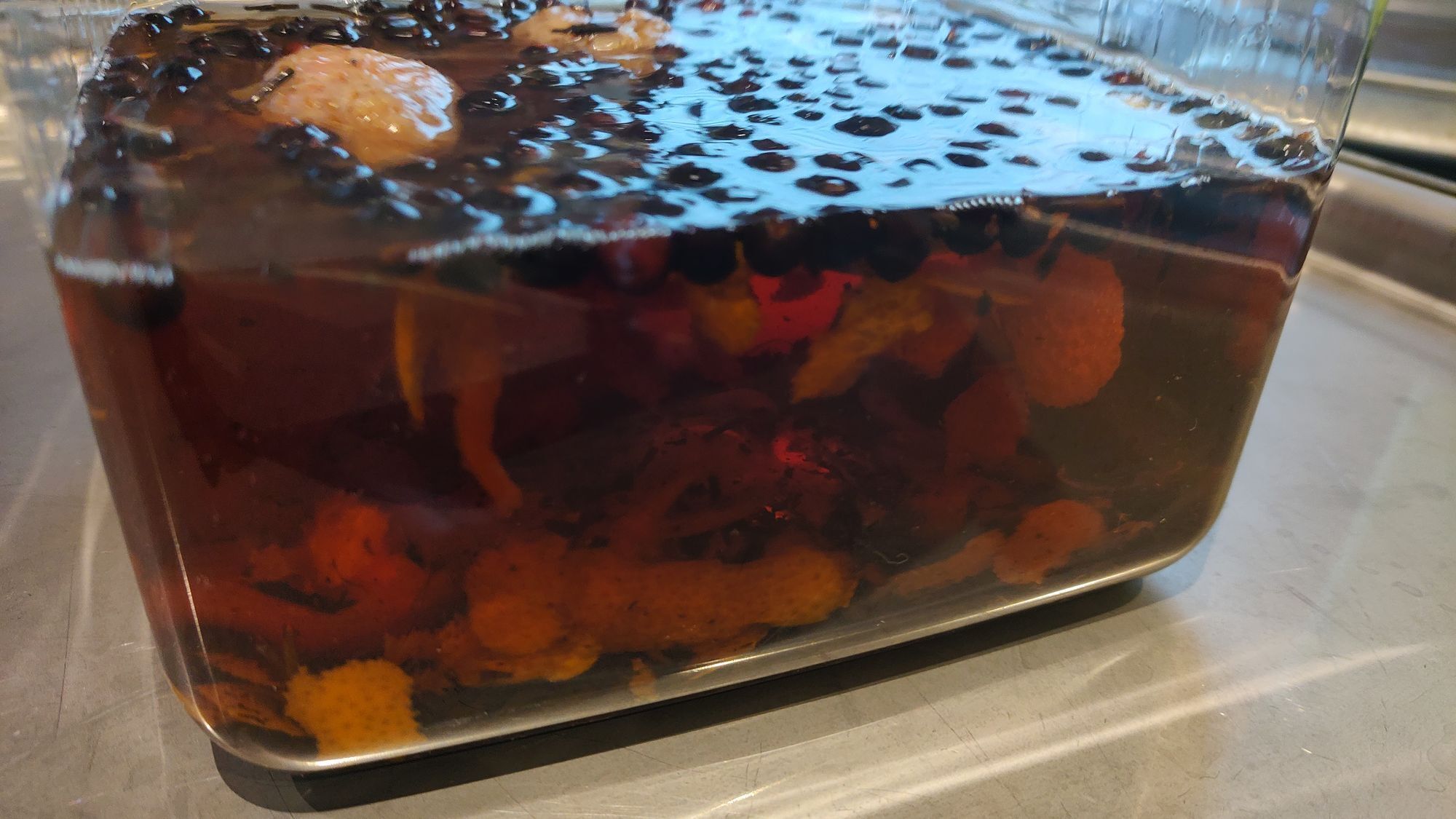 写真は試作を検討段階でのボタニカルを漬け込んでいる様子です。蒸留の際にこのボタニカルの香りがジンに取り込まれ、特色のある香りを形成します。