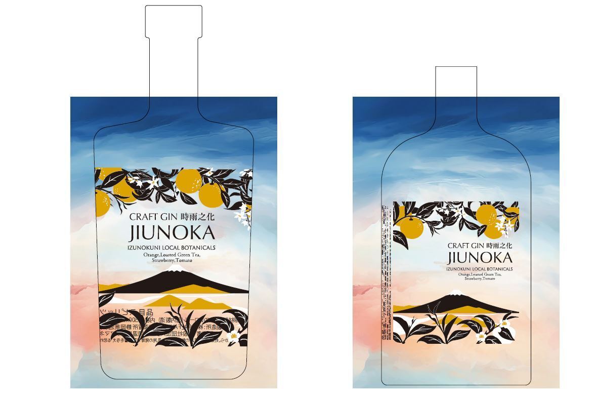 ラベルは、キーボタニカルとして使用した伊豆の国市特産品のみかんとお茶の花や葉を表現し、ボトルの後ろ側には伊豆の国市から見える雄大な富士山と狩野川が浮かび上がるデザインとしました。自然豊かなこの地域を表現した美しいラベルづくりにこだわり、特殊な樹脂印刷を採用してビンの表と裏を合わせて一つとなるラベルデザインとしています。