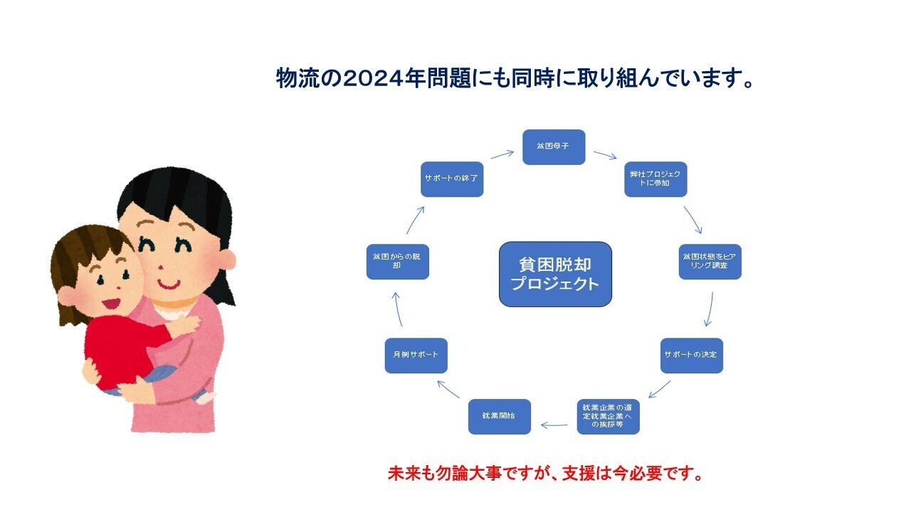 私たちは、このプロジェクトで母子家庭、貧困女子の方々の力になること。そして物流業界を通して貧困生活から脱却してもらい、子供達が未来を想像できる生活を送れる様にしたい、これを実現することを願いプロジェクトを立ち上げたいと熱望しています。